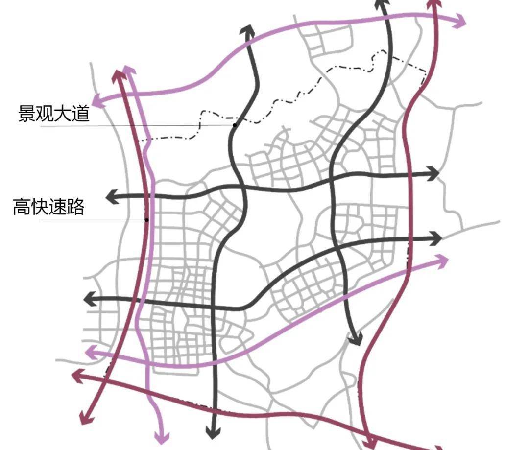 改变以往规划过于强调北向及西向的问题,规划开放式道路网布局,打通各方向主要通道,增强各个方向的辐射能力。