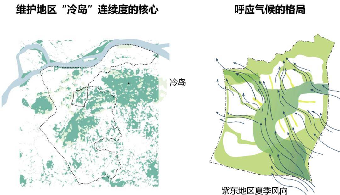 从地区总体生态格局上看,紫东地区核心区是山水生态廊道的重要节点,也是维护地区“冷岛”连续度的核心,其内部的山水田林应得到充分的保护。