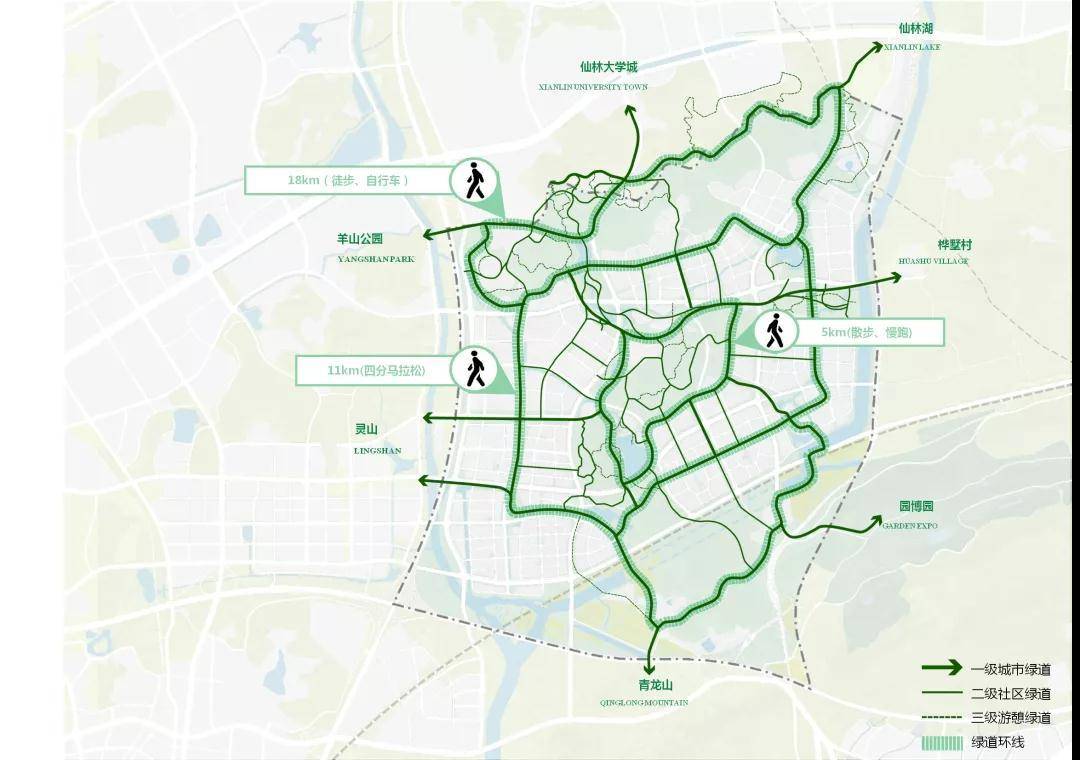 建立安全、连续、环境友好的慢行系统,形成三层级三环带的慢行系统骨架:一级城市绿道、二级社区绿道、三级游憩绿道。