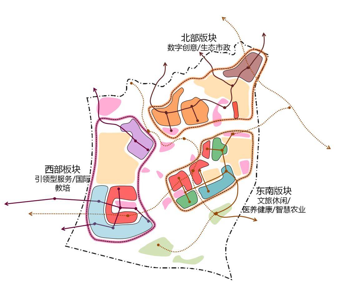 方案以紫东地区核心区作为“高端制造-科技创新-文旅休闲”多重产业协同发展的中枢和全面提升的引擎,提出了分别以引领型服务业、数字创意产业和文旅休闲产业为主导的,并混合有教育、医养健康、生态市政等特色产业的三大综合型功能板块。