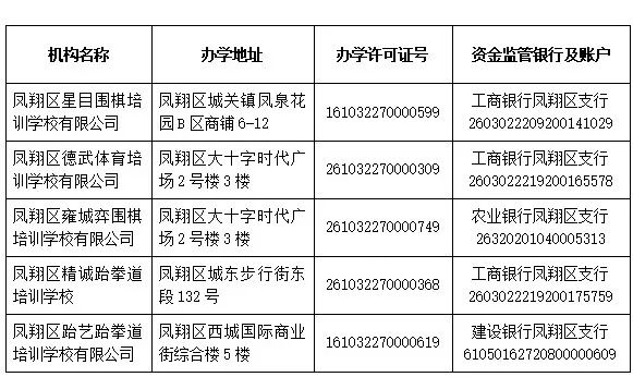 为深入贯彻《中共中央办公厅 国务院办公厅关于进一步减轻义务教育阶段学生作业负担和校外培训负担的意见》(中办发〔2021〕40号)精神,认真落实《宝鸡市凤翔区校外培训机构专项治理工作方案》等文件要求,进一步规范全区体育类校外培训机构办学行为,现将具有办学资质的体育类校外培训机构“白名单”向社会予以公布。