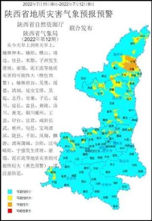 陕西省自然资源厅与陕西省气象局联合发布地质灾害气象预报预警:预计2022年7月11日08时至2022年7月12日08时,榆林神木、榆阳、横山、靖边、佳县、米脂、子洲发生滑坡、崩塌、泥石流等地质灾害的可能性大(橙色预警);榆林府谷、吴堡、绥德、清涧,延安宝塔、吴起、志丹、安塞、子长、延川、延长、富县、黄陵、洛川、黄龙,铜川耀州、王益、印台、宜君,咸阳长武、彬州、旬邑,宝鸡渭滨、陇县、千阳、凤翔、麟游,渭南蒲城、合阳,汉中略阳、宁强发生滑坡、崩塌、泥石流等地质灾害的可能性较大(黄色预警),请注意防范。