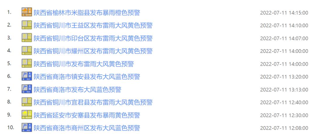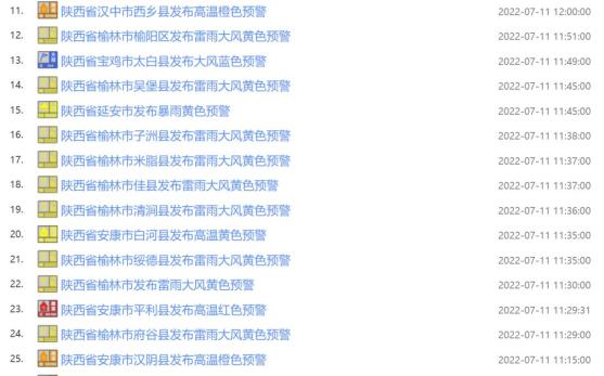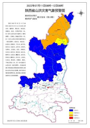 陕西省水利厅与陕西省气象局联合发布山洪灾害气象预警:预计2022年7月11日8时至2022年7月12日8时,神木市、榆阳区、横山区、靖边县、米脂县、佳县、吴堡县等县(市、区)发生山洪灾害可能性大(橙色预警),子洲县、绥德县等县(市、区)发生山洪灾害的可能性较大(黄色预警),府谷县、靖边县、定边县、清涧县、子长市、延川县、延长县、吴起县、志丹县、安塞区、宝塔区、甘泉县、富县、黄陵县、宜君县、洛川县、黄龙县、旬邑县、彬州市、长武县、麟游县、永寿县、淳化县、耀州区、印台区、王益区、白水县、陈仓区、凤翔区、陇县、千阳县等县(市、区)有可能发生山洪灾害(蓝色预警)。各级水利部门要加强山洪隐患巡查排查,做好山洪灾害站点监测,及时发布区域风险预警信息,提请地方政府提前组织人员转移避险。