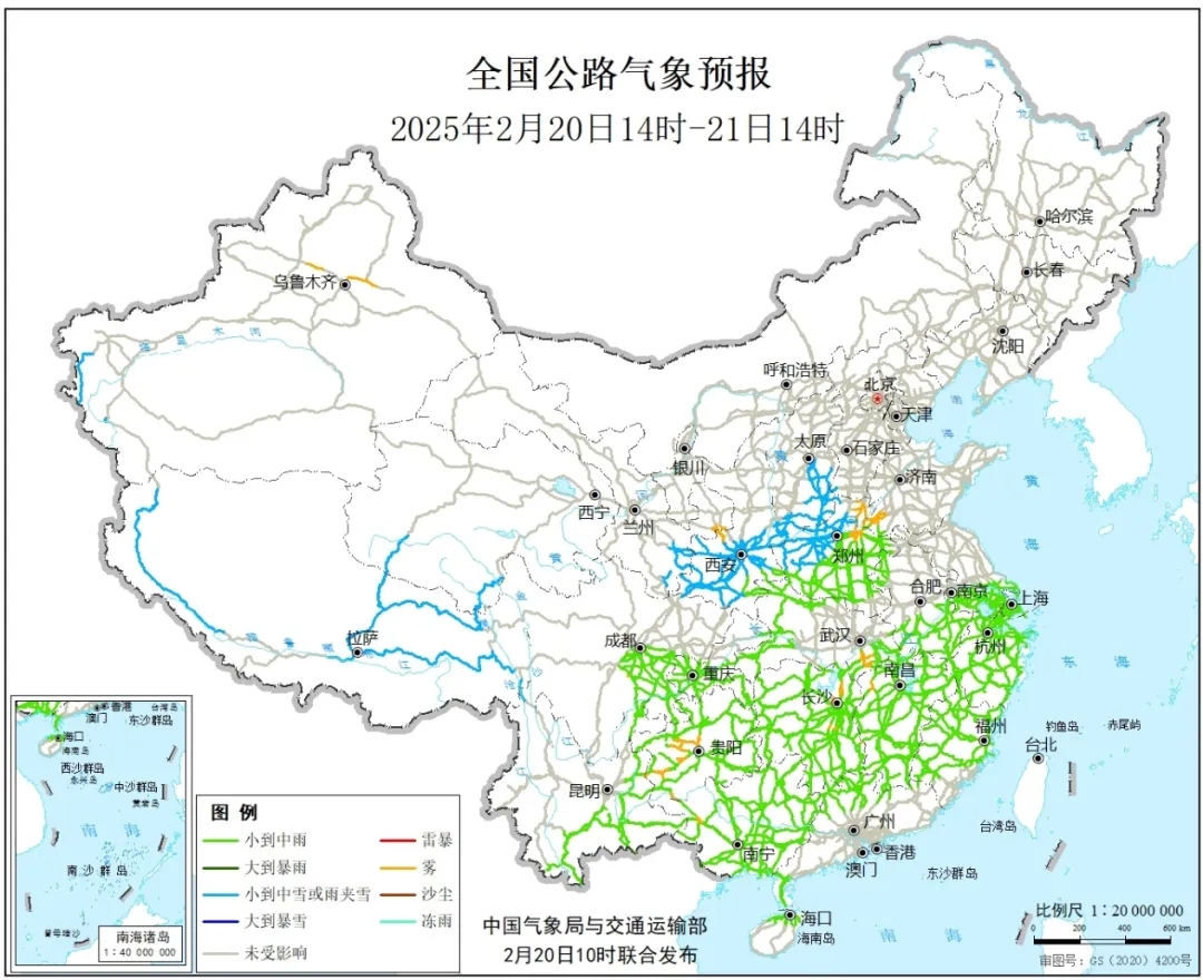 图3 全国公路气象预报图(2月20日14时至21日14时)