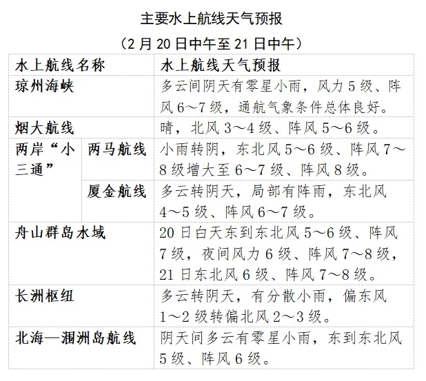 预计20日中午到21日中午,琼州海峡,多云间阴天有零星小雨,风力5级、阵风6~7级,通航气象条件总体良好。