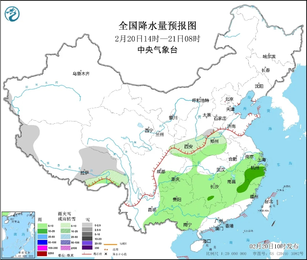 2月20日14时至21日08时,西藏西部和东部、陕西南部、河南北部等地部分地区有小雪或雨夹雪。江淮西部、江汉、江南、西南地区东部、华南西部等地部分地区有小到中雨。西藏中北部、青海南部部分地区有5~6级风(见图1)。