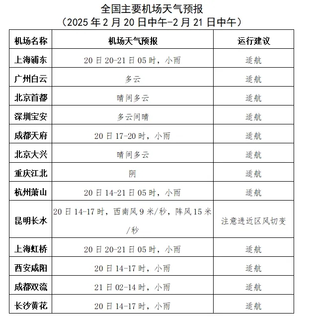 预计20日中午至21日中午,内蒙古中部、辽宁南部、河北北部、北京、天津、山东东部、贵州、广西北部、广东北部、湖南、江西、浙江、上海、福建等地的中低空空域有轻度颠簸;新疆北部、内蒙古东部、黑龙江、吉林、辽宁、河北南部、陕西、山西、河南、山东、湖北、安徽、江苏、上海、浙江北部等地的低空空域有积冰条件。