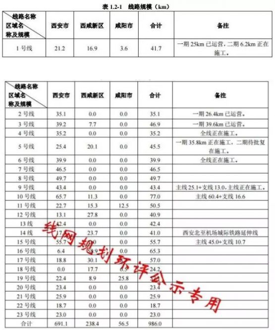 西安未来将有23条轨道交通线路,覆盖关中城市群都市区,主体网络形态呈棋盘+环+放射结构,规划线路总长度986.0km,其中西安市范围内线路长度691.1km,西咸新区范围内线路长度为238.4km,咸阳市区范围内线路长度56.5km。