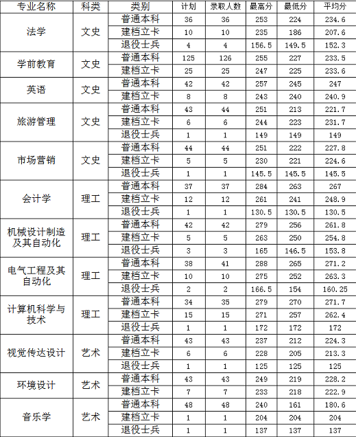 宝鸡文理学院专升本2022分数线已经正式对外公布,该校今年的招生计划是700人,分数线是按照普通类、退役士兵、建档立卡最低录取分数线进行录取。普通批次和建档立卡批次的最低录取分数线相差不大,退役士兵分数线相对较低,其中普通批次最低录取分数线是旅游管理213分,其他专业详情如下: