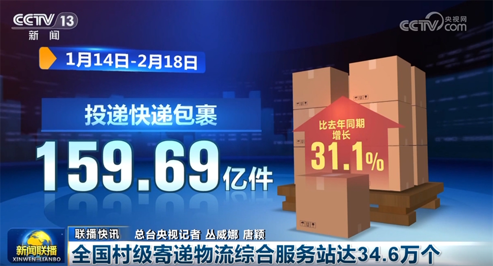 国家邮政局最新数据显示,自春运开始以来,全国邮政快递业揽收快递包裹155.49亿件,比去年同期增长29%;投递快递包裹159.69亿件,比去年同期增长31.1%。如今每天有超1亿件的快件在农村地区进出,截至目前全国已建成村级寄递物流综合服务站建设34.6万个,超七成的建制村每周投递五次及以上。