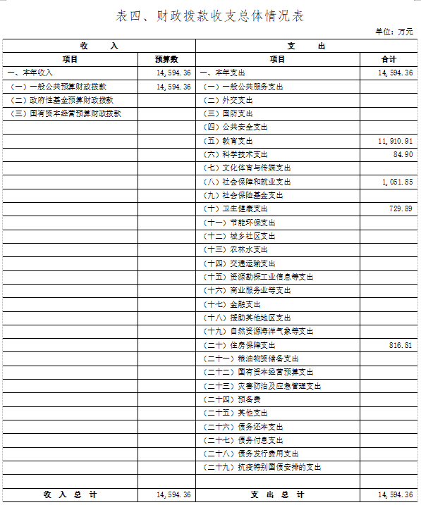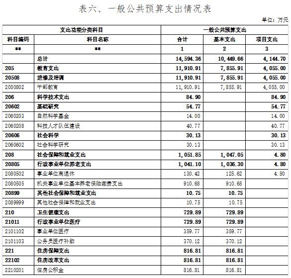 2025年一般公共预算支出14,594.36万元,包括:教育支出11,910.91万元、科学技术支出84.90万元、社会保障和就业支出1,051.85万元、卫生健康支出729.89万元、住房保障支出816.81万元。