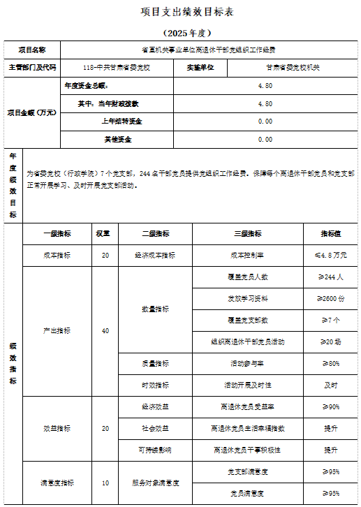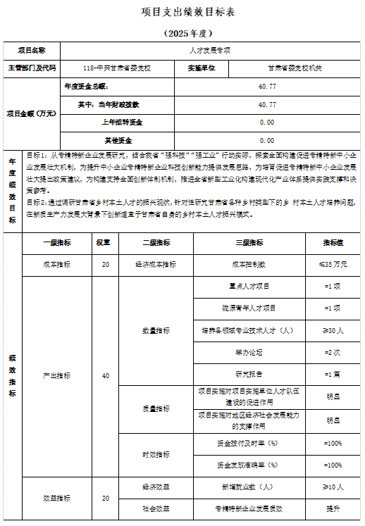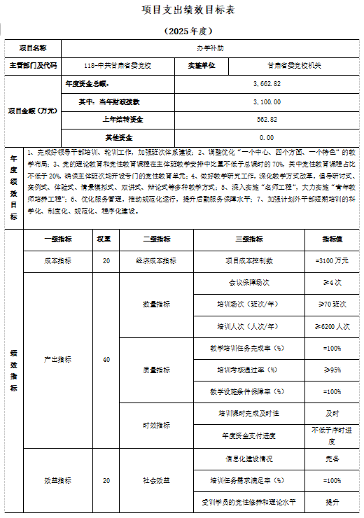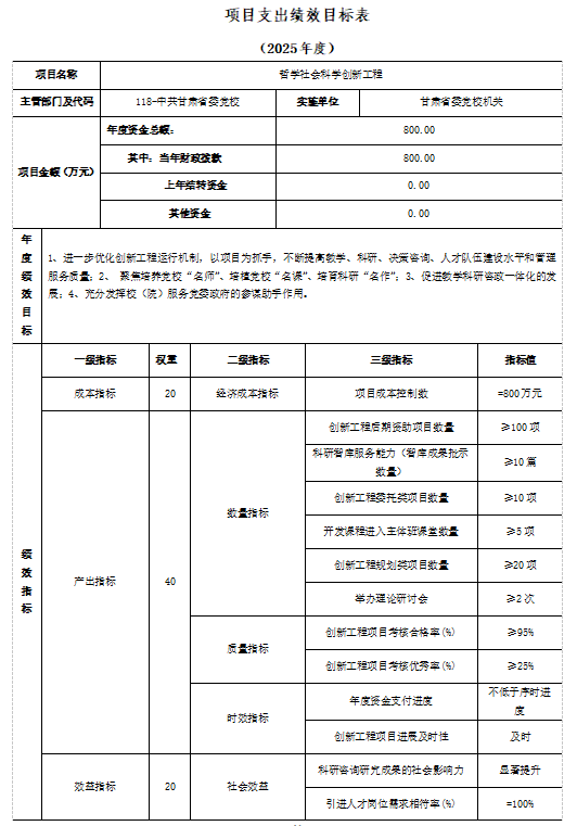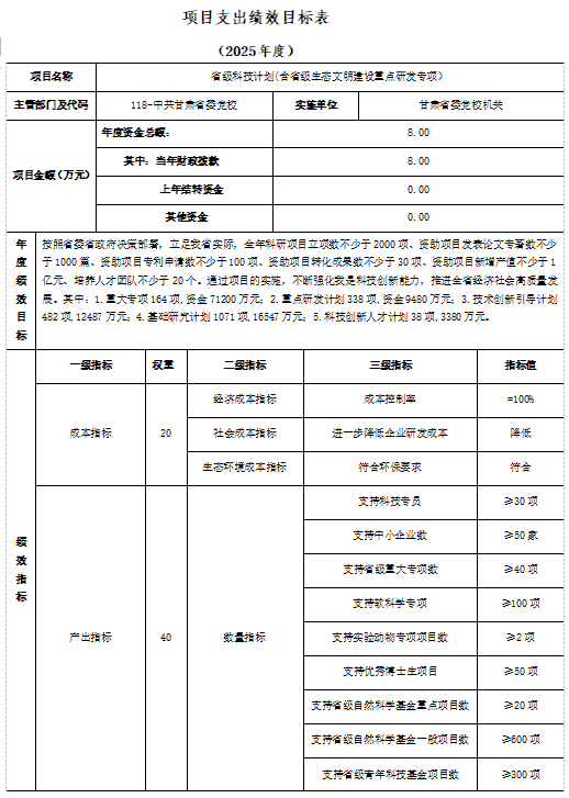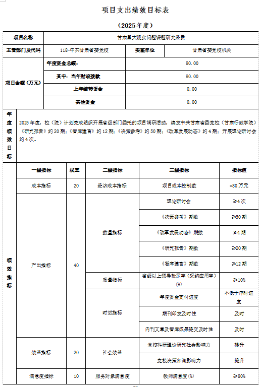7、预期总体目标:2025年度,校(院)计划完成组织开展省级部门委托的项目调研活动,编发中共甘肃省委党校(甘肃行政学院)《研究报告》约20期;《智库建言》约12期;《决策参考》约50期;《改革发展动态》约4期;开展理论研讨会约4次。