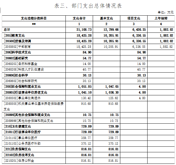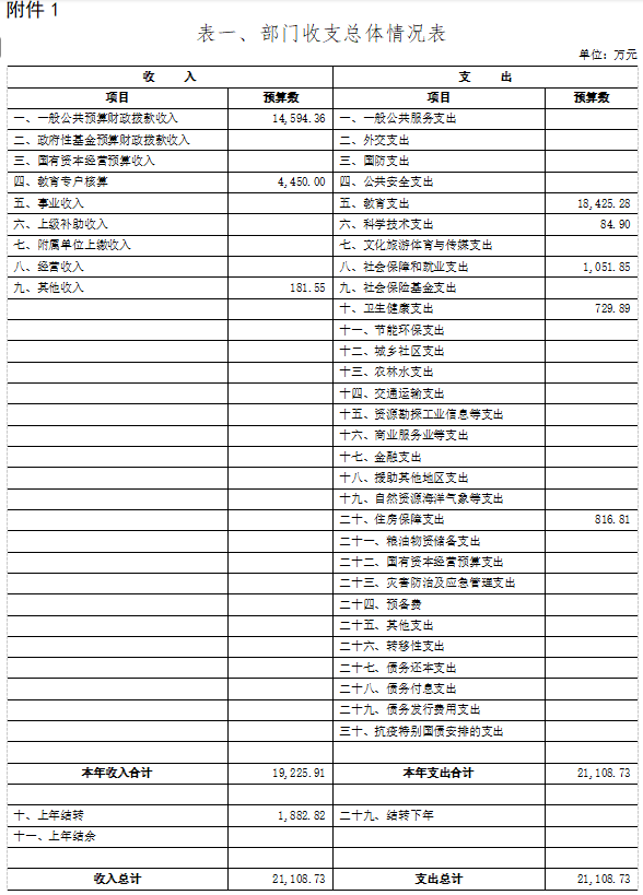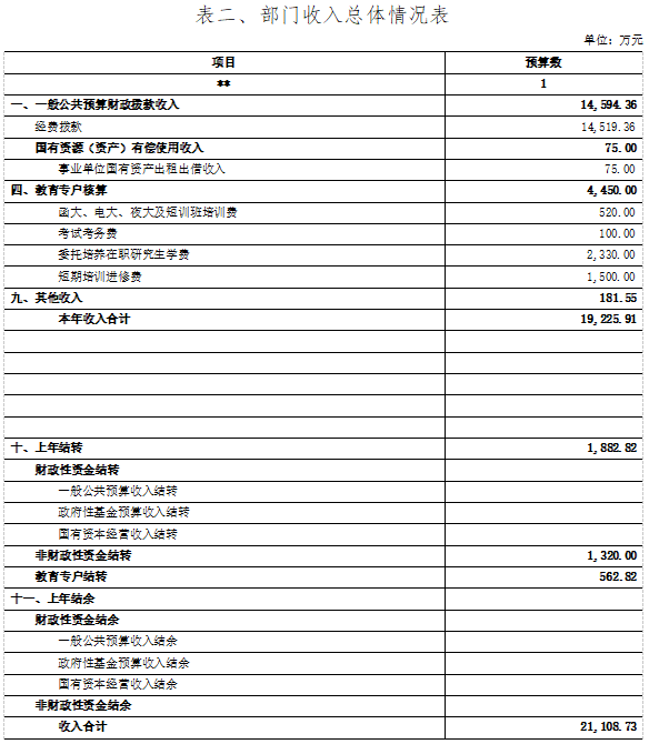 2025年部门收支总预算21,108.73万元。按照综合预算的原则,部门所有收入和支出均纳入部门预算管理。收入包括:一般公共预算拨款收入、教育专户收入、其他收入、上年结转;支出包括:教育支出、科学技术支出、社会保障和就业支出、卫生健康支出、住房保障支出。