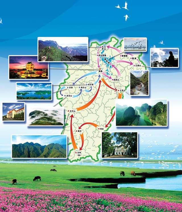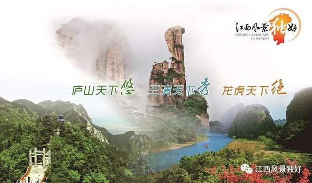 江西,素有“物华天宝、人杰地灵”之美誉。赣鄱大地,“四大名山”巍然屹立:庐山雄奇险秀、井冈山红旗漫卷、三清山峰林奇观、龙虎山道教祖庭;“四大摇篮”红动中国: 中国革命的摇篮井冈山、人民军队的摇篮南昌、人民共和国的摇篮瑞金、中国工人运动的摇篮安源;“四个千年”流芳千古:千年瓷都景德镇、千年名楼滕王阁、千年书院白鹿洞、千年古刹东林寺。中国最大的淡水湖鄱阳湖,渔舟唱晚,候鸟天堂;“中国最美的乡村”婺源,小桥流水,如诗如画;赣南客家围屋,民风浓郁,独具魅力。武功山、黄岗山、大觉山、灵山,山山钟灵毓秀、鬼斧神工;庐山西海、仙女湖、陡水湖,湖水碧波荡漾,赏心悦目。此外,婺源篁岭、上饶灵山、樟树盐温泉、安福羊狮慕、明月山小火车、中华贤母园、大余丫山、中国洞都等一批新开发的景区(点)也已投放市场,深受游客青睐。好山好水好风光,与厚重悠久的历史文化相得益彰,美丽乡村、闲适田园与古朴民俗风情相映成趣,历史文化与绿色生态浑然一体,江西可谓是一块自然天成与人文造化完美结合的旅游宝地。