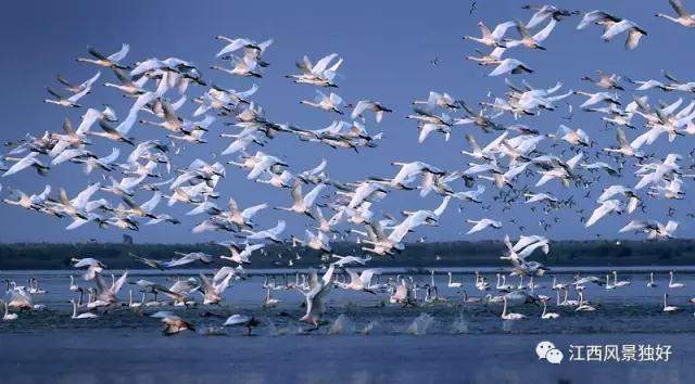 鄱阳湖是中国最大的淡水湖,冬日渐冷,候鸟南飞,白鹤、大雁等大批珍禽在此过冬,“飞时遮尽云和月,落时不见湖边草”。