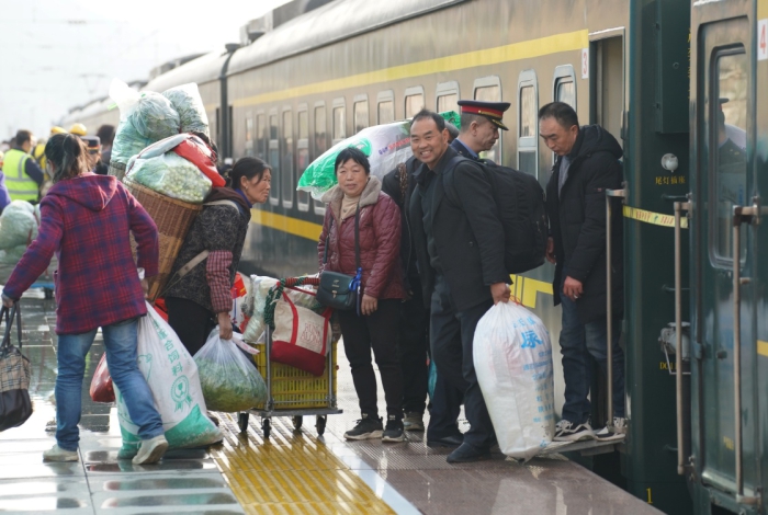 2月17日,在位于陕西汉中市的阳平关站,乘客从6064次列车上下车。新华社记者邵瑞 摄