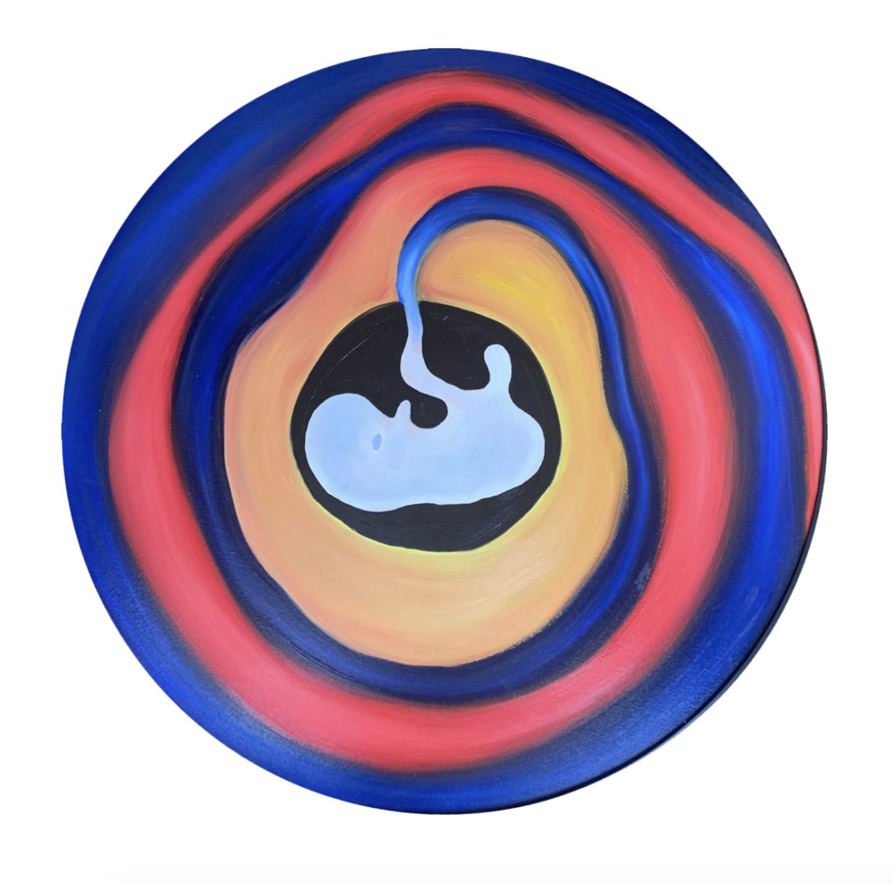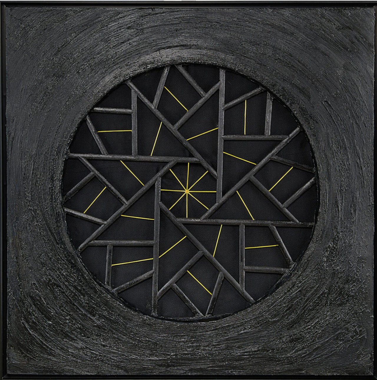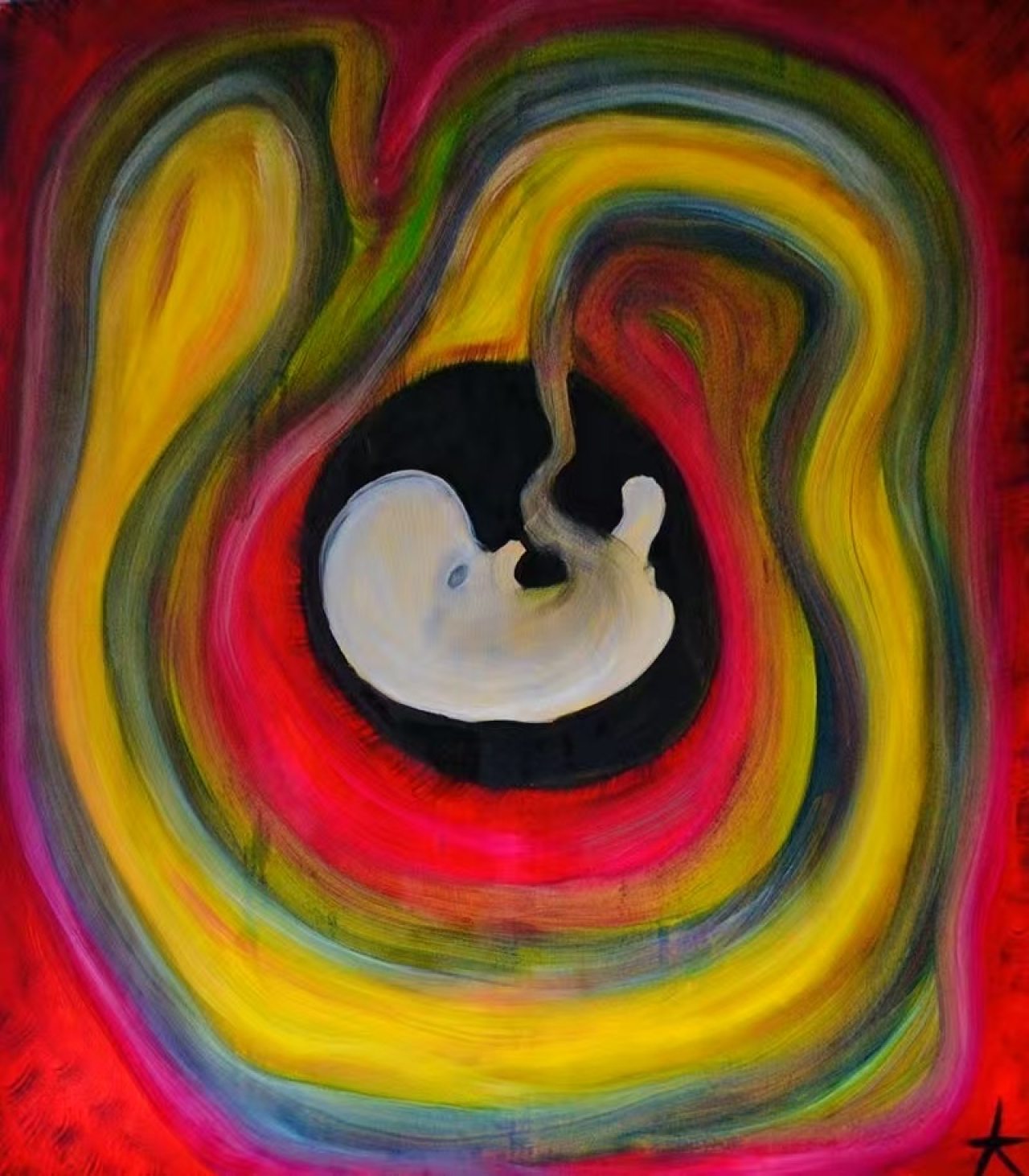 Daga:传统上,人们认为白色和黑色不属于彩色范畴。然而,对我而言,它们却是色彩斑斓的。黑色,对我而言,它象征着深邃的暗面。它同时也是宇宙的底色。因为当你仰望宇宙,你会发现它是漆黑一片的。以这幅画为例,它名为《永恒的存在》,表示当你合上双眼,便能感受到一种永恒的存在感,生命循环往复,不断回归。这里的八角形的图案是八卦的象征,或许是佛陀的八正道。因此,黑色并不代表负面,黑色代表着未知的事物。对我来说,未知是一片探索自我的沃土。因此我并不认为在我的画作中,黑色承载着消极的寓意,也不认为白色必然象征着积极。对我而言,黑色实际上是蕴藏着光明的,因为光明常常从黑暗中诞生。