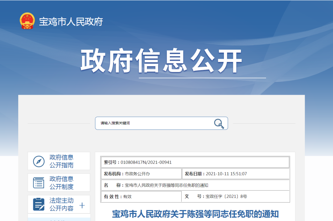 宝鸡市政府发布任免职通知 陈强任命为宝鸡市地震局局长