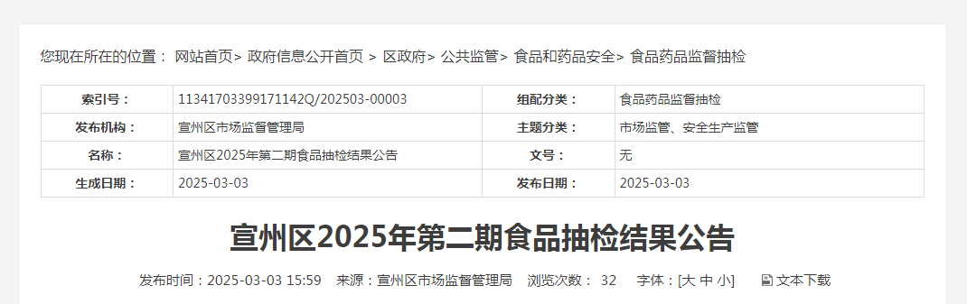 安徽省宣城市宣州区2025年第二期食品抽检结果公告