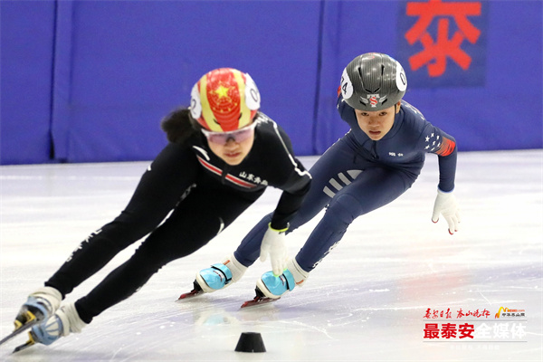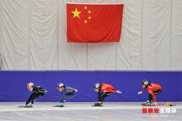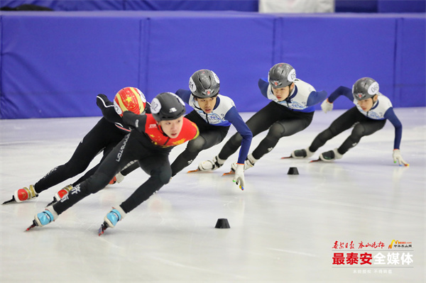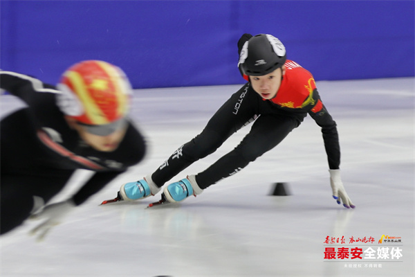 起跑、变道、下刀、摆臂、急速转弯……随着发令枪声响起,泰山冰雪文体中心冰体馆内,上演了冰上“速度与激情”。在率先进行的甲组男子1500米半决赛中,身着色彩艳丽短道服装的运动员脚踩冰刀,在光滑洁白的冰面上飞驰,你追我赶,赛场争夺异常激烈。