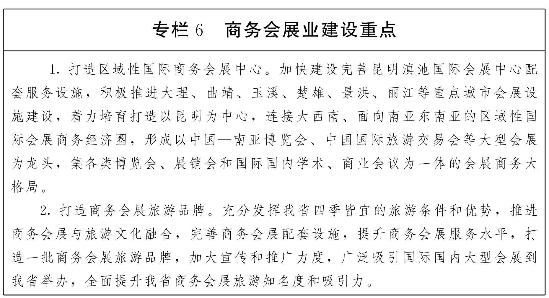 充分利用我省独特的沿边区位优势及发展商务会展的良好基础条件,以昆明、大理、玉溪、曲靖、楚雄、景洪、丽江等重点城市为依托,加快昆明滇池国际会展中心等会展设施建设,着力办好中国—南亚博览会和中国国际旅游交易会,积极组织招徕大型商务会展活动,不断提高商务会展服务水平,把我省建设成为我国面向南亚东南亚的区域性国际商务会展中心。鼓励支持跨国集团、大企业集团以我省为总部基地,举办面向南亚东南亚的各类重点展会、大型会议和奖励旅游等。充分利用全省各地文物博物馆和文物藏品,举办情趣高雅、寓教于乐,群众喜欢、游客慕名而来的各类文博展览会等。积极引进国内外知名会展企业来滇创办会展企业,鼓励社会资本进入会展行业,打造策划、代理、广告、宣传、工程等会展全产业链产品,培育提升 “南博会“、“旅交会“、“农博会 “文博会”等一批国际商务会展品牌,不断提高商务会展品牌价值和效益。