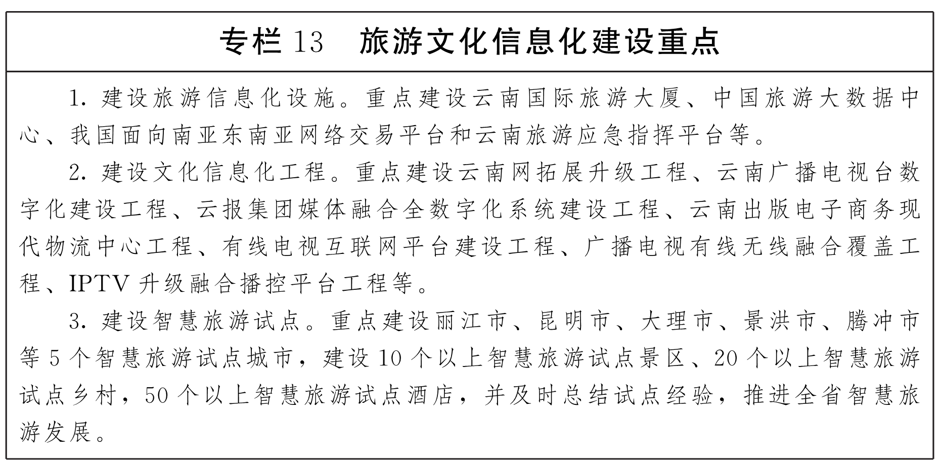 1.建设旅游信息化设施。重点建设云南国际旅游大厦、中国旅游大数据中心、我国面向南亚东南亚网络交易平台和云南旅游应急指挥平台等。(省旅游发展委牵头;省发展改革委、工业和信息化委、财政厅、商务厅、外办、统计局,省城市建设投资集团有限公司等配合)