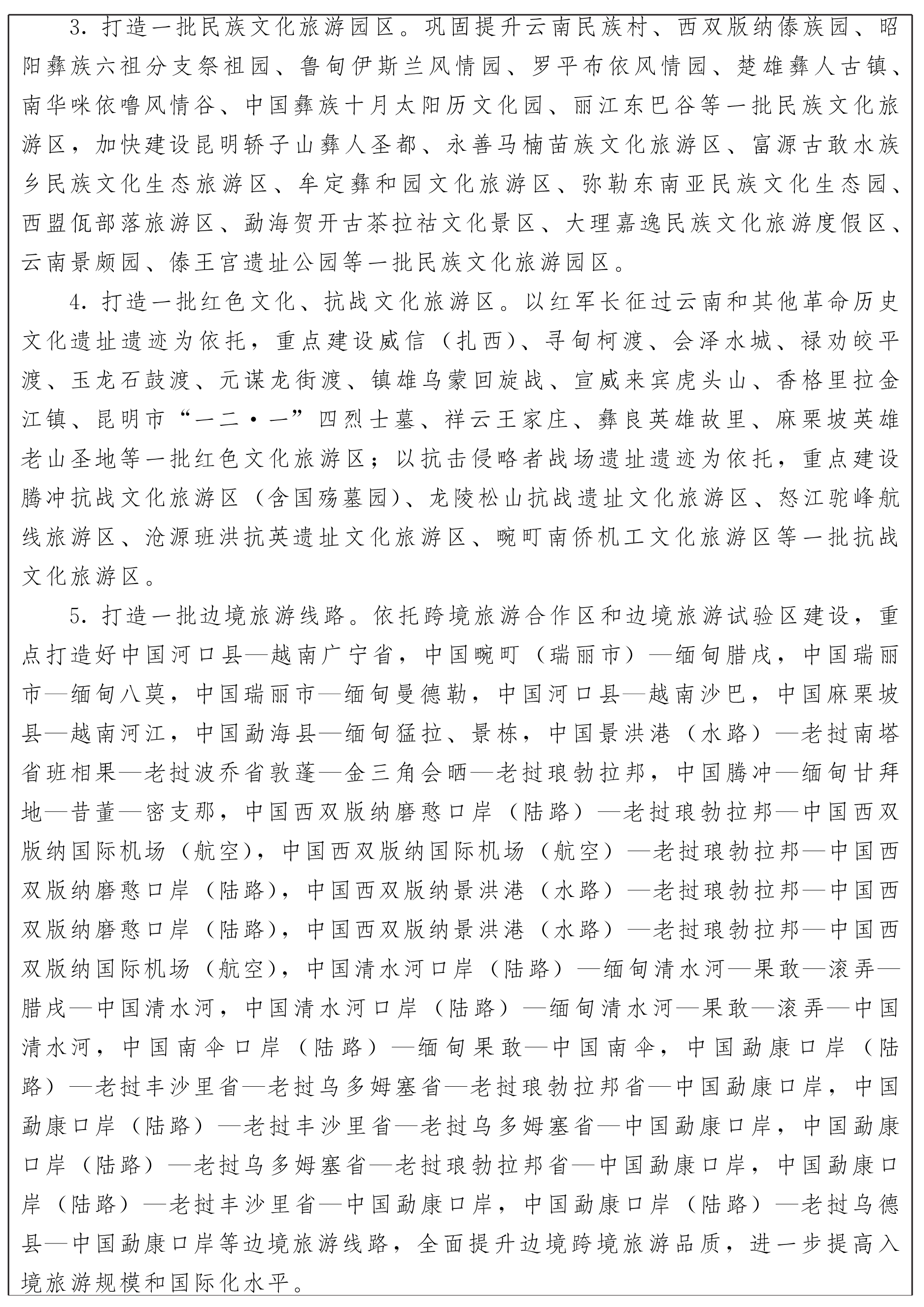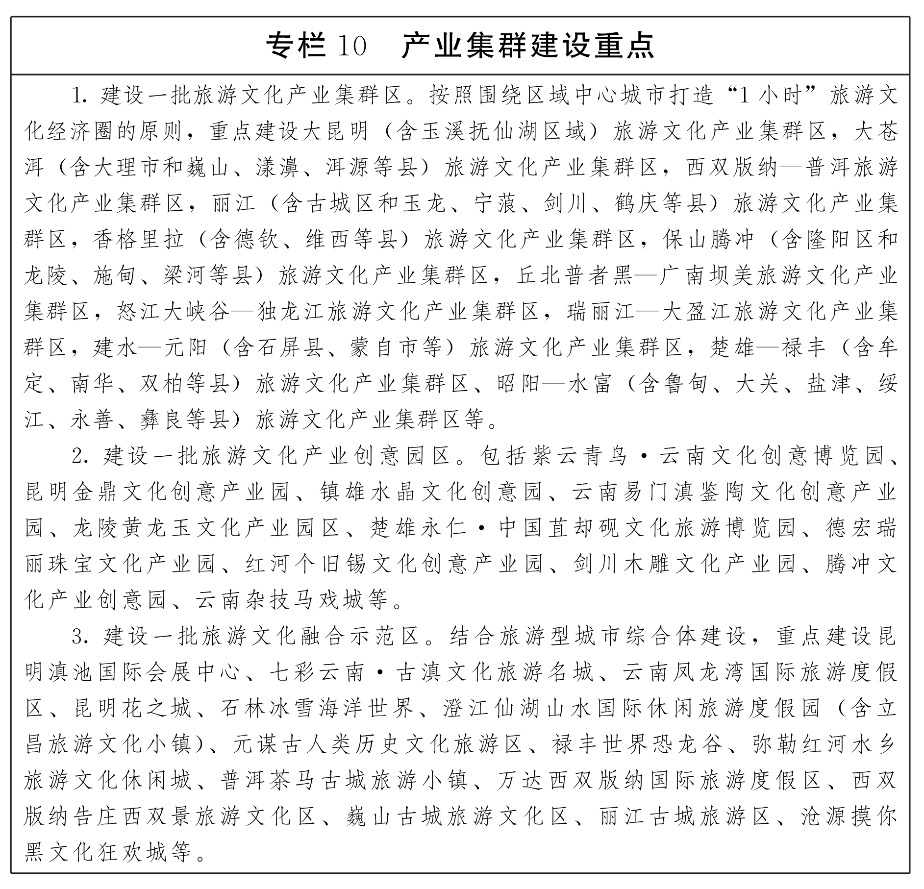 1.建设一批旅游文化产业集群区。重点建设大昆明(含玉溪抚仙湖区域)旅游文化产业集群区,大苍洱(含大理市和巍山、漾濞、洱源等县)旅游文化产业集群区,西双版纳一普洱旅游文化产业集群区,丽江(含古城区和玉龙、宁蒗、剑川、鹤庆等县)旅游文化产业集群区,香格里拉(含德钦、维西等县)旅游文化产业集群区,保山腾冲(含隆阳区和龙陵、施甸、梁河等县)旅游文化产业集群区,丘北普者黑一广南坝美旅游文化产业集群区,怒江大峡谷一独龙江旅游文化产业集群区,瑞丽江一大盈江旅游文化产业集群区,建水一元阳(含石屏县、蒙自市等)旅游文化产业集群区,楚雄一禄丰(含牟定、南华、双柏等县)旅游文化产业集群区、昭阳一水富(含鲁甸、大关、盐津、绥江、永善、彝良等县)旅游文化产业集群区等。(省旅游发展委牵头;省文产办、发展改革委、财政厅、国土资源厅、住房城乡建设厅、交通运输厅、文化厅,有关州、市人民政府配合)