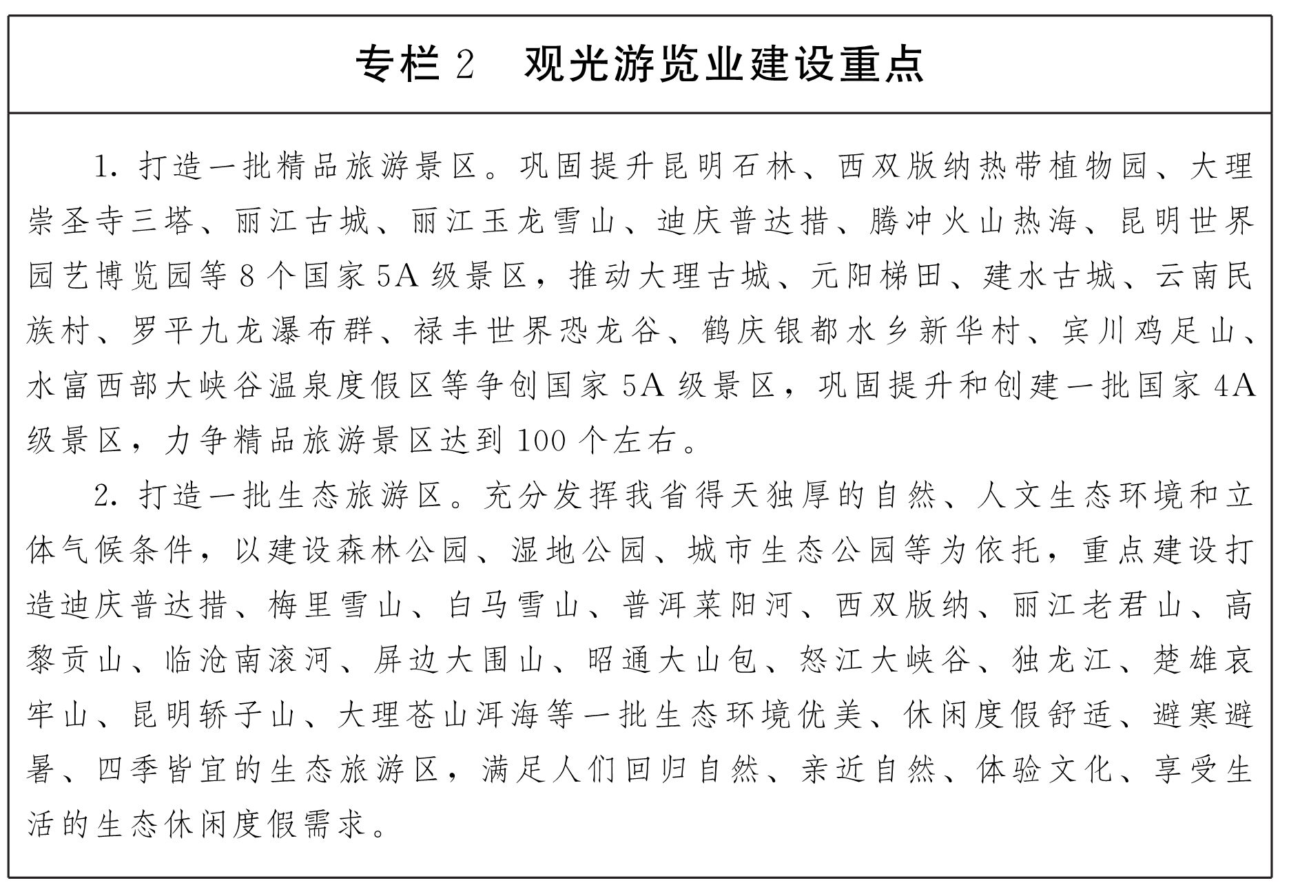 适应旅游文化消费升级新变化和新特点,巩固提升传统旅游景区,增加文化内涵,丰富游览内容,重点打造一批国家5A级、4A级精品旅游景区。充分发挥我省优美的生态环境优势,积极推进湿地公园、森林公园、城市公园等建设发展,重点建设发展迪庆普达措、西双版纳、怒江大峡谷等一批生态旅游区,全面提升生态旅游文化内涵和品质。充分发掘少数民族特色建筑、文化艺术、生活习俗、喜庆节、风味食品、竞技活动等资源特色,加快建设一批民族文化旅游园区,提升民族文化旅游的参与性、互动性和体验性。积极利用革命纪念地、抗战遗址地、红色文化纪念馆及其所承载的革命精神等,以纳入全国红色旅游经典景区(点)、滇西抗战遗址景区等为重点,打造主题鲜明、内容丰富、时尚性和趣味性强的红色文化旅游产品,更好地满足人们回顾革命历史、缅怀革命先烈和进行爱国主义教育等红色文化旅游需求。充分发挥边境线长的优势,借助“一带一路”、澜沧江湄公河次区域合作机制等,依托跨境旅游合作区和边境旅游试验区建设,以已开通的21条边境旅游线路为重点,培育打造边境旅游产品和精品旅游线路,打造黄金旅游文化廊道,全面提升边境旅游品质,进一步提高入境旅游规模和国际化水平。