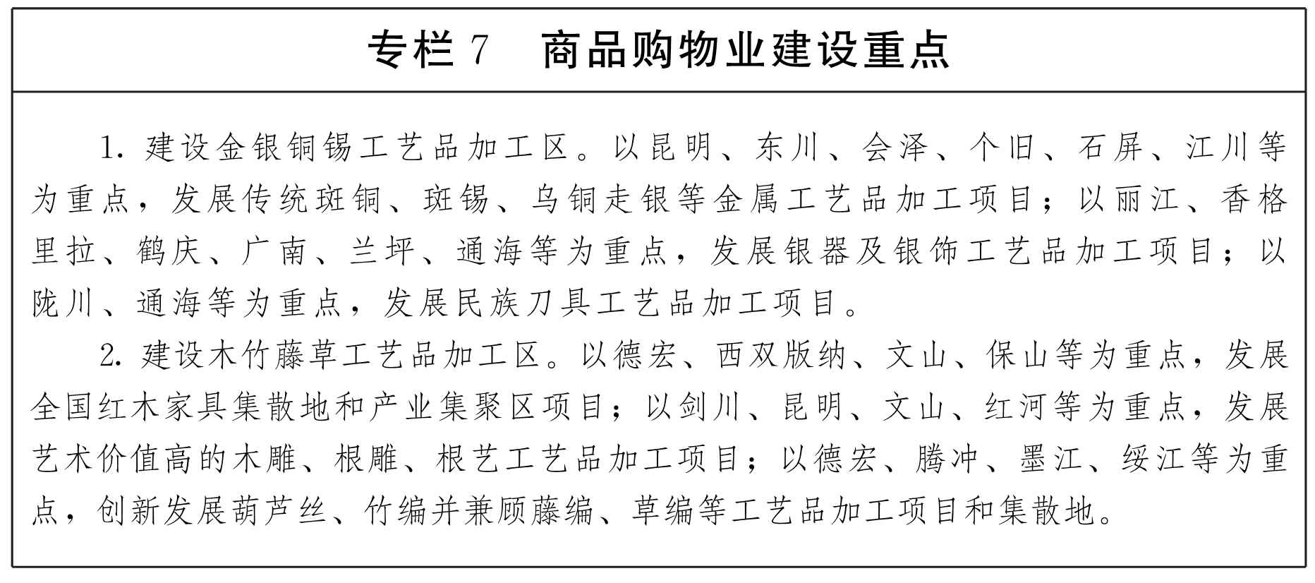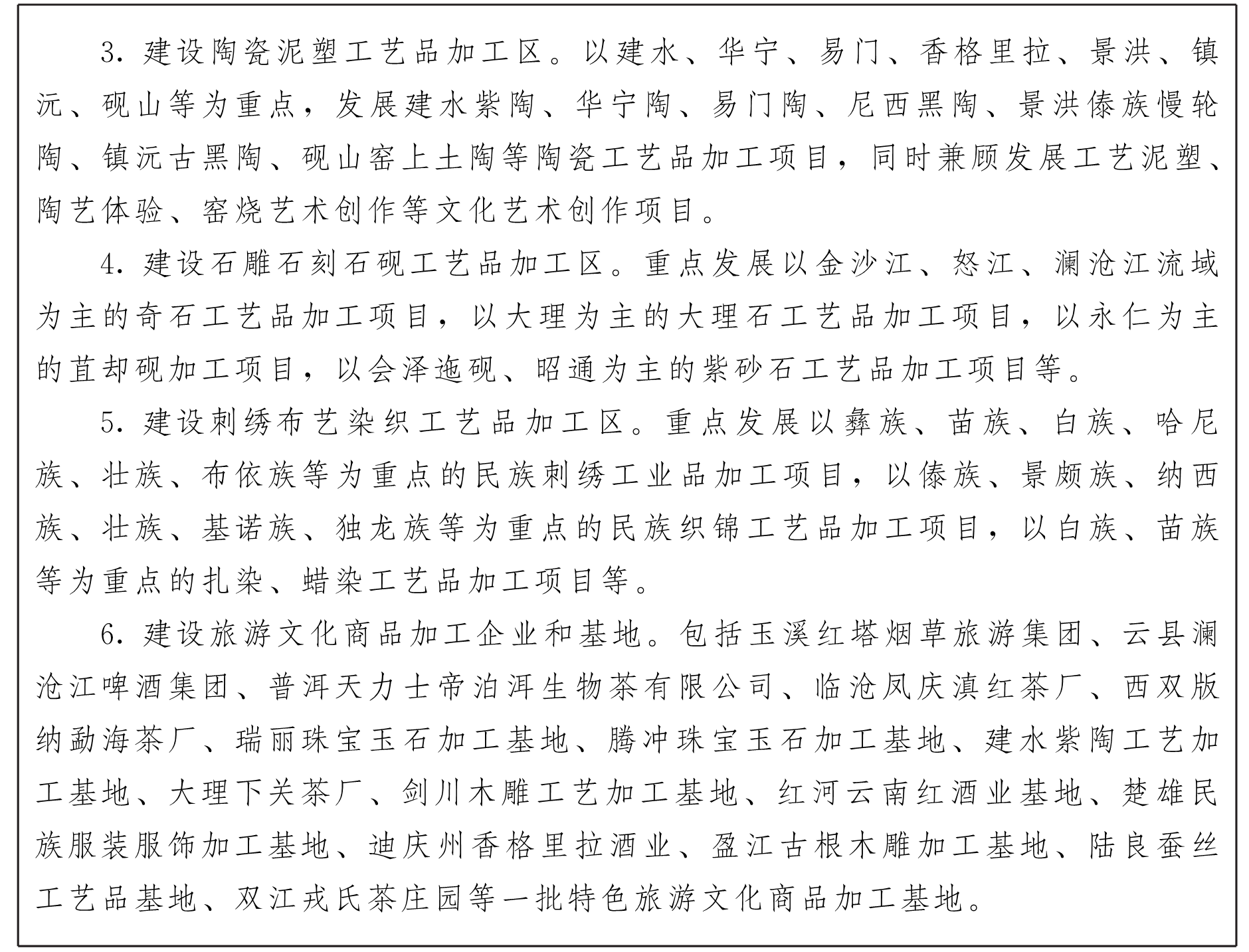 1.建设民族民间工艺品加工区。重点建设金银铜锡、木竹藤草、陶瓷泥塑、石雕石刻石砚、刺绣布艺染织等一批民族民间工艺品加工区,构建以“金、木、土、石、布”民族民间工艺品为重点的旅游文化商品体系。(省工业和信息化委牵头;省文产办、发展改革委、财政厅、国土资源厅、住房城乡建设厅、商务厅、文化厅、旅游发展委,有关州、市人民政府配合)