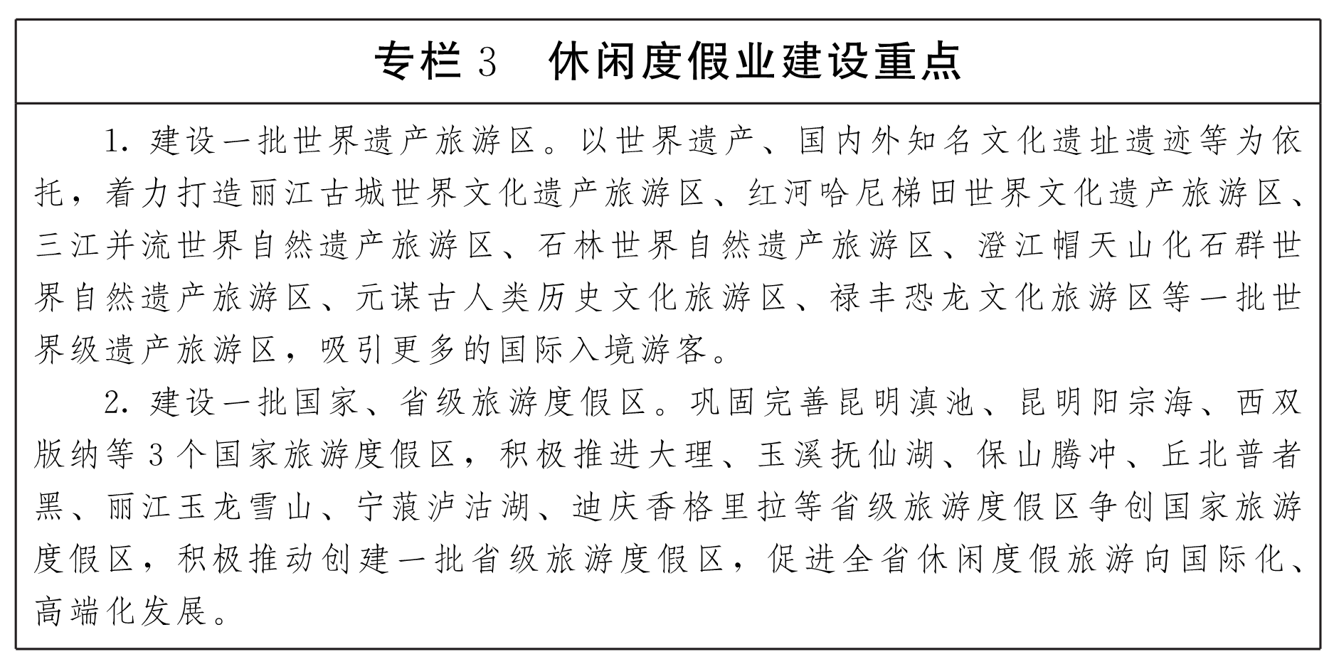 面向日益旺盛的休闲度假旅游需求,特别要瞄准欧美、日韩等高消费游客来源地,充分发挥我省良好的生态环境、众多的高原湖泊、世界遗产资源和独特的立体气候条件,以重大重点项目建设为带动,加快建设以昆明石林、丽江古城等为重点的世界遗产旅游区,以昆明滇池、阳宗海和西双版纳等为重点的国家级、省级旅游度假区,以旅游文化城镇为依托的特色休闲街区等,重点打造一批文化内涵丰富、休闲娱乐独特、度假环境舒适的休闲度假区,大力开发面向海外游客和国内中高端游客的休闲度假产品,进一步增强对国内外游客的吸引力。启动建设一批以旅游目的地、高等级公路等为依托的自驾车房车露营地产品,力争将我省打造成为中国首个“自驾友好型旅游目的地省”。抓住全省航空机场、高铁和金沙江、澜沧江航运建设加速的新机遇,实施空中、高铁旅游快线工程,加快研发推出一批航空旅游、高铁旅游、水上旅游等新产品。