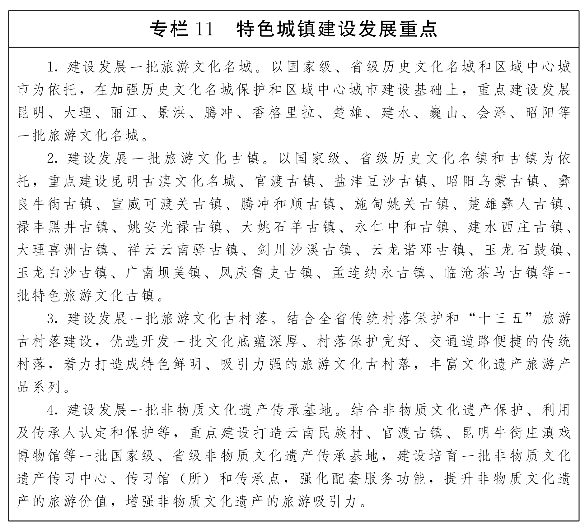 充分发挥与合理利用云南历史文化名城、特色古镇和传统村落等资源优势,在加强历史文化资源保护,发掘修复文化遗址遗迹,改善生态文化环境基础上,加快建设批主题鲜明、交通便利、服务配套、环境优美的旅游文化名城、旅游文化古镇、旅游文化古村落等,鼓励支持各地加强非物质文化遗产传承保护与合理开发利用,建设提升一批非物质文化遗产基地、传习中心和馆(所),完善各类历史文化博物馆、展览馆、乡土文化展示室的配套设施和旅游服务功能,为打造知名度高、吸引力强、内容丰富的旅游文化产品奠定坚实基础。