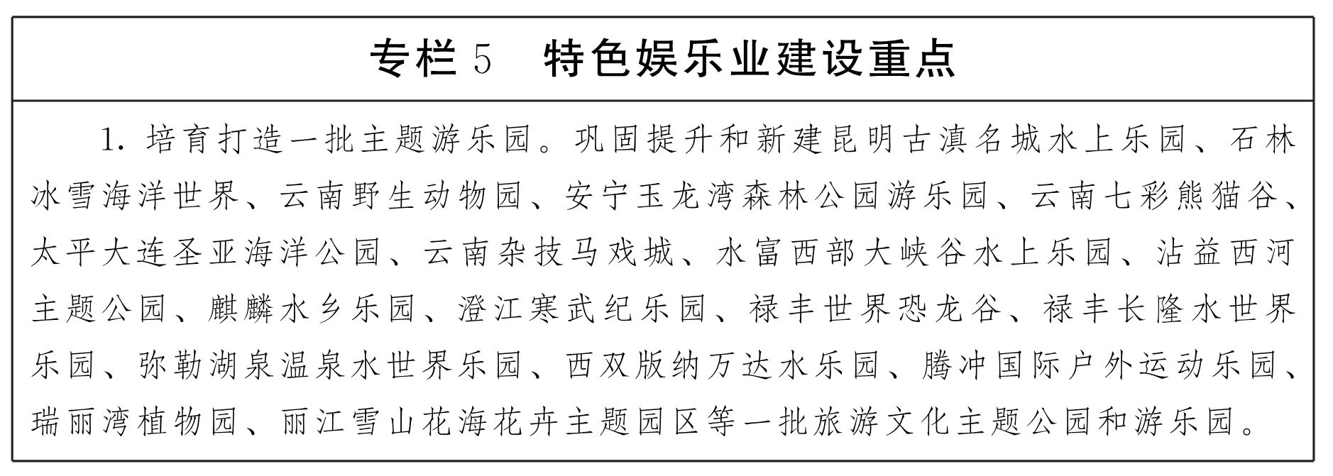 1.培育打造一批主题游乐园。巩固提升和新建昆明古滇名城水上乐园、石林冰雪海洋世界、云南野生动物园、安宁玉龙湾森林公园游乐园、云南七彩熊猫谷、太平大连圣亚海洋公园、云南杂技马戏城、水富西部大峡谷水上乐园、沾益西河主题公园、麒麟水乡乐园、澄江寒武纪乐园、禄丰世界恐龙谷、禄丰长隆水世界乐园、弥勒湖泉温泉水世界乐园、西双版纳万达水乐园、腾冲国际户外运动乐园、瑞丽湾植物园丽江雪山花海花卉主题园区等一批旅游文化主题公园和游乐园。(省旅游发展委牵头;省发展改革委、国土资源厅、环境保护厅、住房城乡建设厅、交通运输厅、水利厅、文化厅,有关州、市人民政府配合)