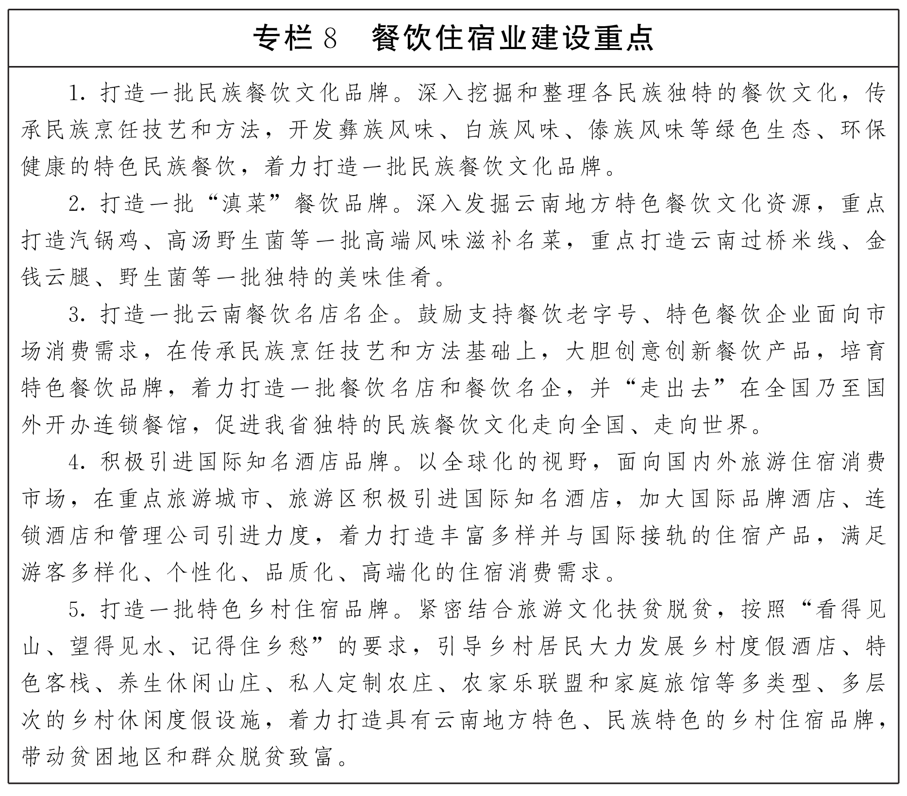 以打造“绿色、生态、环保、健康”的餐饮品牌为重点,深入挖掘民族风味和地方小吃,积极开发绿色健康的食品饮品,构建由原材料生产、策划传播、实体销售、配送经营、网点分销等多业态组成的餐饮业链条,形成高中低档相结合的旅游餐饮体系,推动餐饮品牌化、特色化、多元化发展。充分发挥我省民族餐饮文化源远流长、丰富多彩的比较优势,深入挖掘和整理各民族独特的餐饮文化,传承民族烹饪技艺和方法,开发绿色生态、环保健康的特色民族餐饮,展示特色餐饮文化,打造民族餐饮文化品牌。发挥“滇菜”选料丰富广泛,烹制讲究本味和原汁原味,口味鲜嫩酥脆和清香回甜,就餐环境民族风味浓郁等特色,培育打造一批“滇菜”精品名牌。推进餐饮服务与国际接轨,积极引进国内外知名餐饮品牌,在重点城市和旅游文化区,建设特色餐饮街区,形成品牌化、多样化的餐饮产品,满足游客多样化餐饮消费需求。以度假型、商务型和经济型酒店为重点,以民居客栈、家庭旅馆、休闲农庄等为补充,大力推行品牌化管理、连锁化经营、人性化服务和标准化发展加大星级住宿设施评定力度,推进绿色饭店的申报、创建和评审,形成结构合理的多层次旅游住宿体系,全面提升旅游住宿能力和服务水平。