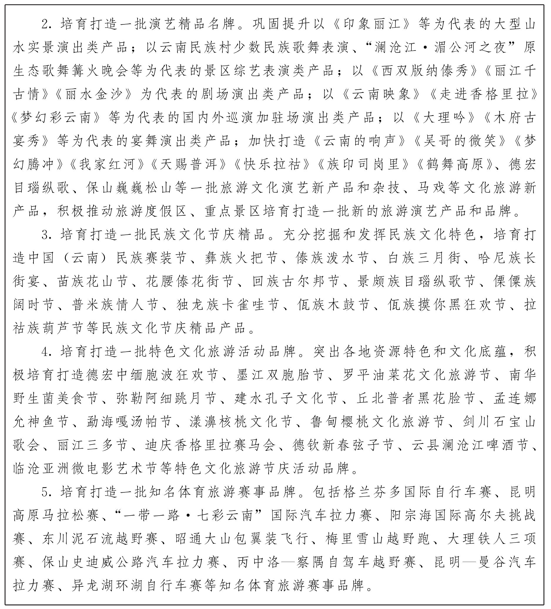 2.培育打造一批演艺精品名牌。巩固提升以《印象丽江》等为代表的大型山水实景演出类产品;以云南民族村少数民族歌舞表演、“澜沧江·湄公河之夜”原生态歌舞篝火晚会等为代表的景区综艺表演类产品;以《西双版纳傣秀》《丽江千古情》《丽水金沙》为代表的剧场演出类产品;以《云南映象》《走进香格里拉》《梦幻彩云南》等为代表的国内外巡演加驻场演出类产品;以《大理吟》《木府古宴秀》等为代表的宴舞演出类产品;加快打造《云南的响声》《吴哥的微笑》《梦幻腾冲》《我家红河》《天赐普洱》《快乐拉祜》《族印司岗里》《鹤舞高原》、德宏目瑙纵歌、保山巍巍松山等一批旅游文化演艺新产品和杂技、马戏等文化旅游新产品,积极推动旅游度假区、重点景区培育打造一批新的旅游演艺产品和品牌。(省文产办牵头;省发展改革委、财政厅、文化厅、旅游发展委,有关州、市人民政府配合)