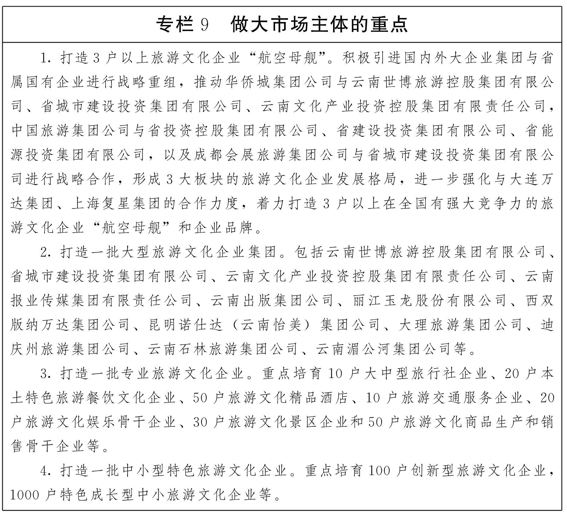1.打造3户以上旅游文化企业“航空母舰”。积极引进国内外大企业集团与省属国有企业进行战略重组,推动华侨城集团公司与云南世博旅游控股集团有限公司省城市建设投资集团有限公司、云南文化产业投资控股集团有限责任公司,中国旅游集团公司与省投资控股集团有限公司、省建设投资集团有限公司、省能源投资集团有限公司,以及成都会展旅游集团公司与省城市建设投资集团有限公司进行战略合作,形成3大板块的旅游企业发展格局,进一步强化与大连万达集团、上海复星集团的合作力度,着力打造3户以上在全国有强大竞争力的旅游文化企业“航空母舰”和企业品牌。(省国资委牵头;省文产办、财政厅丁文化厅、旅游发展委、金融办,省投资控股集团有限公司、省建设投资集团有限公司、云南世博旅游控股集团有限公司、省城市建设投资集团有限公司、云南文化产业投资控股集团有限责任公司、省能源投资集团有限公司等配合)