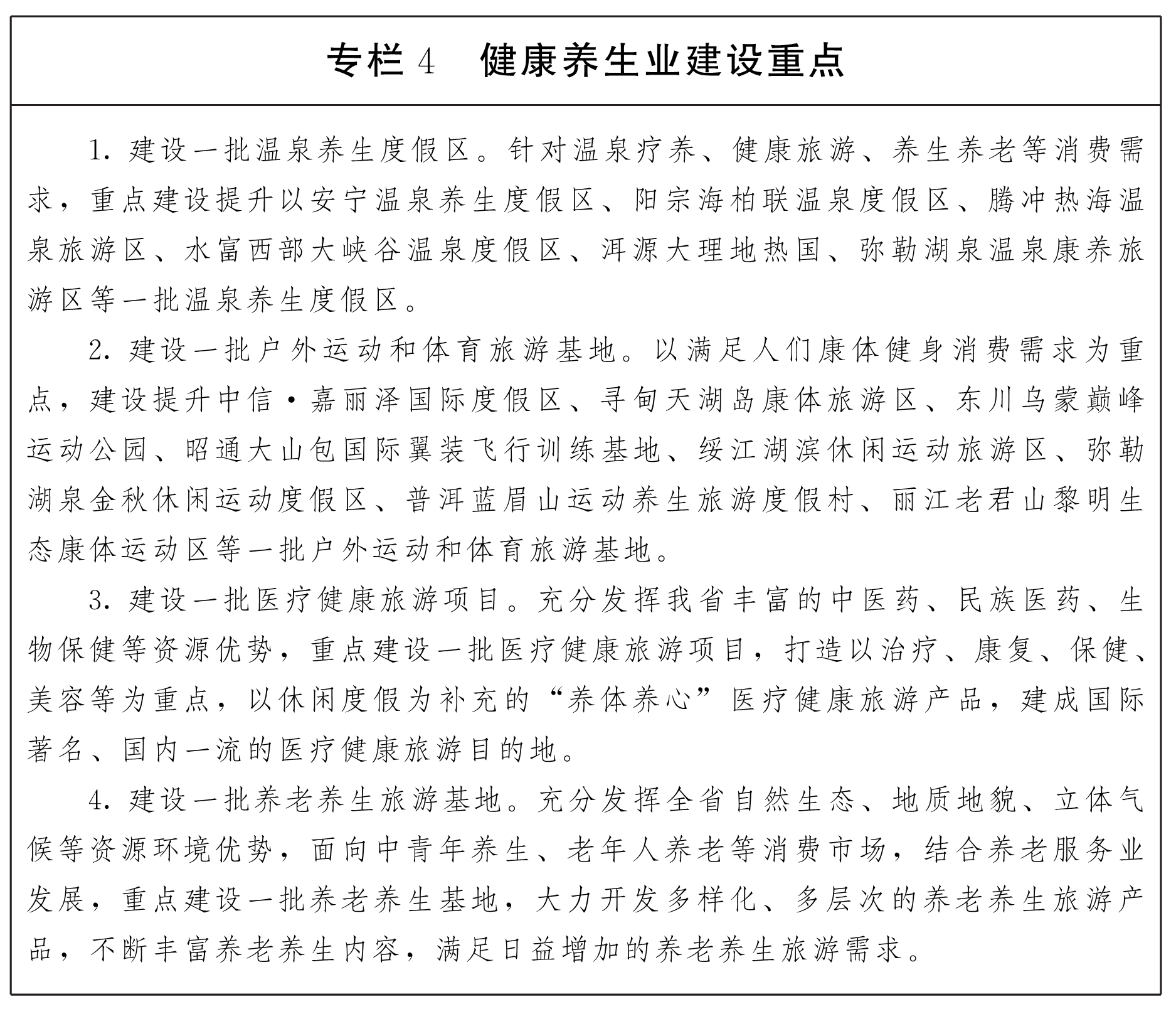 1.建设一批温泉养生度假区。针对温泉疗养、健康旅游、养生养老等消费需求,重点建设提升以安宁温泉养生度假区、阳宗海柏联温泉度假区、腾冲热海温泉旅游区、水富西部大峡谷温泉度假区、洱源大理地热国、弥勒湖泉温泉康养旅游区等一批温泉养生度假区。(省旅游发展委牵头;省发展改革委、国土资源厅、环境保护厅、住房城乡建设厅、交通运输厅,有关州、市人民政府配合)