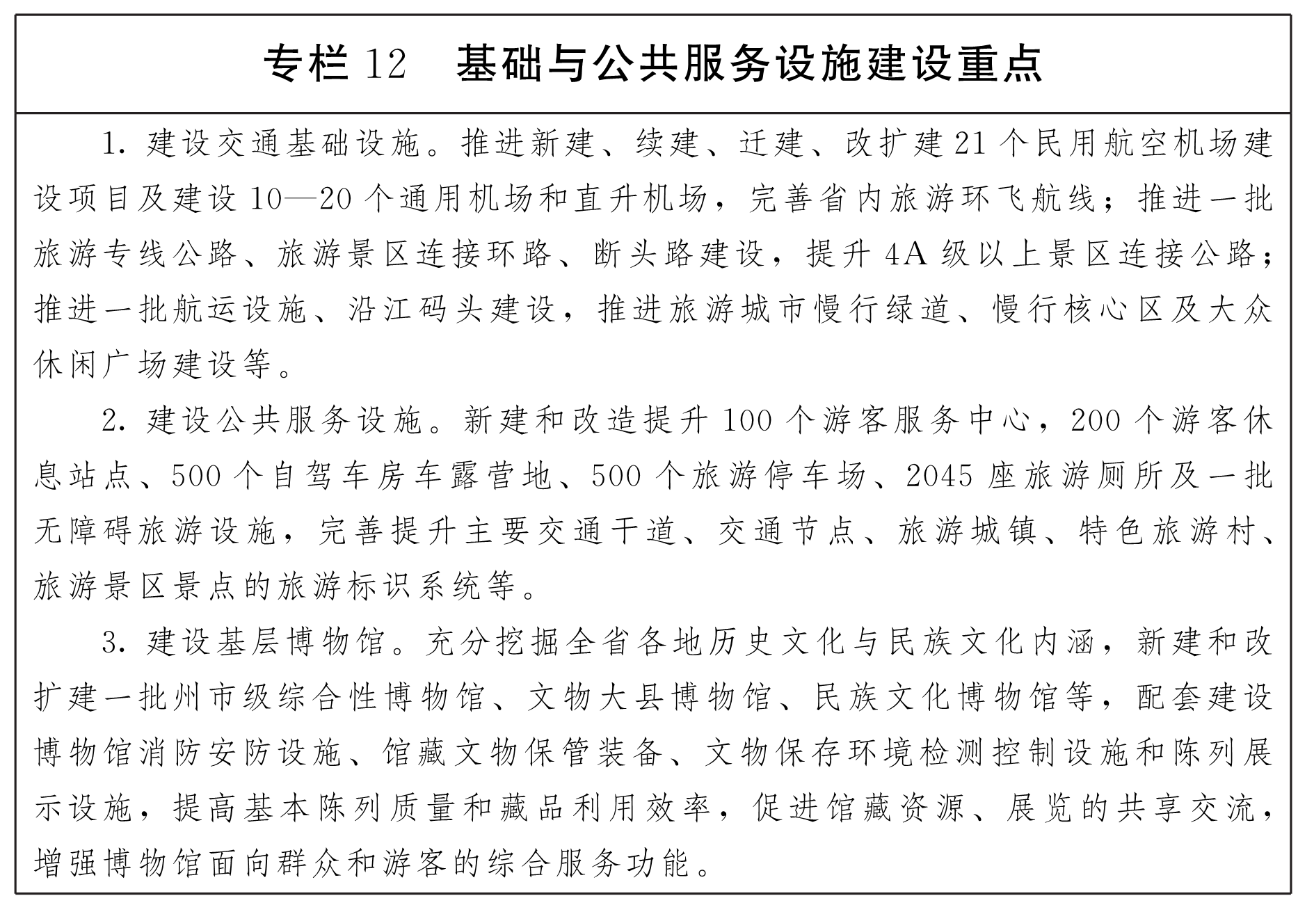以国家推进基本公共服务均等化为契机,新建改建一批游客服务中心,建设提升一批主干公路沿线休息站点,结合自助自驾游发展新趋势,加快建设一批自驾车房车露地和停车场。深入实施旅游“厕所革命”,抓紧新建改造一批旅游厕所,确保全省旅游厕所建设达到全国中上水平,同时针对城乡公共厕所设施薄弱的突出问题,推动改造提升一批城镇、乡村公共厕所,更好满足游客和当地居民的需求。在全省交通主干线和重点景区连接道路,新建和改造提升一批旅游标识标牌,确保公路沿线都设有明确、规范的旅游标识系统。新建和改扩建一批基层博物馆,加快建立以古迹建筑群为内容的遗址博物馆、专题博物馆、民族文化展示馆等旅游文化设施和乡村文化公共设施,全面提升旅游文化公共服务能力和水平。
