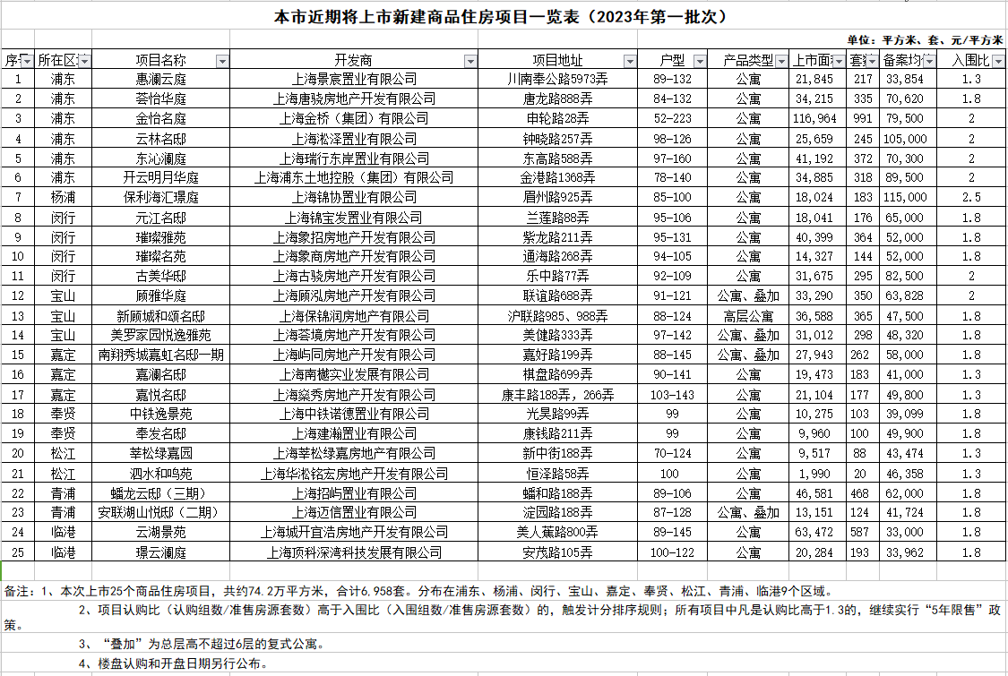 该批房源分布于全市8个辖区,包括浦东、杨浦、闵行、宝山、嘉定、奉贤、松江、青浦。其中,备案均价在6万元/平方米以下的项目15个,面积占比约46%;6到10万元/平方米以下的项目8个,面积占比约48.1%;10万元/平方米以上的项目2个,面积占比约5.9%。续盘项目14个,1年内续开盘未涨价;新开盘项目11个,按照房地联动价或参照周边同品质项目核定价格。