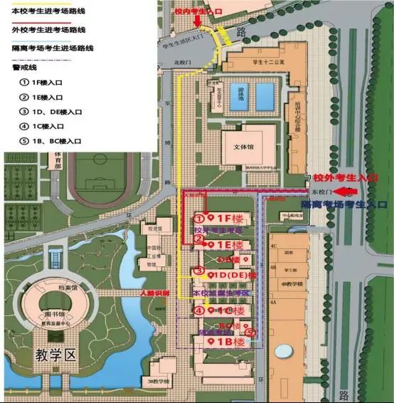 1.校外考生可于早上6:30由我校东门经检验准考证、有效身份证件合格后,通过测温通道进入学校。考前60分钟,开放身份验证通道,考生依次排队,间隔1米以上,通过人脸识别进入考区。