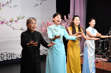 3月19日,“50后”的常德丝弦名家宋洁(左一)、“60后”的常德丝弦代表性传承人朱晓玲(左二)、“80后”的常德丝弦青年传承人伍恩禹(右二)与“90后”青年演员代表谢颜竹(右一)四代曲艺人同场登台共演一支曲目。