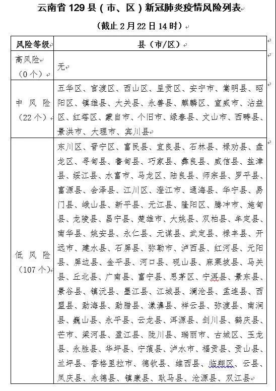 2月22日,云南省卫生健康委员会发布更新后的云南省129个县(市、区)新冠肺炎疫情风险列表。