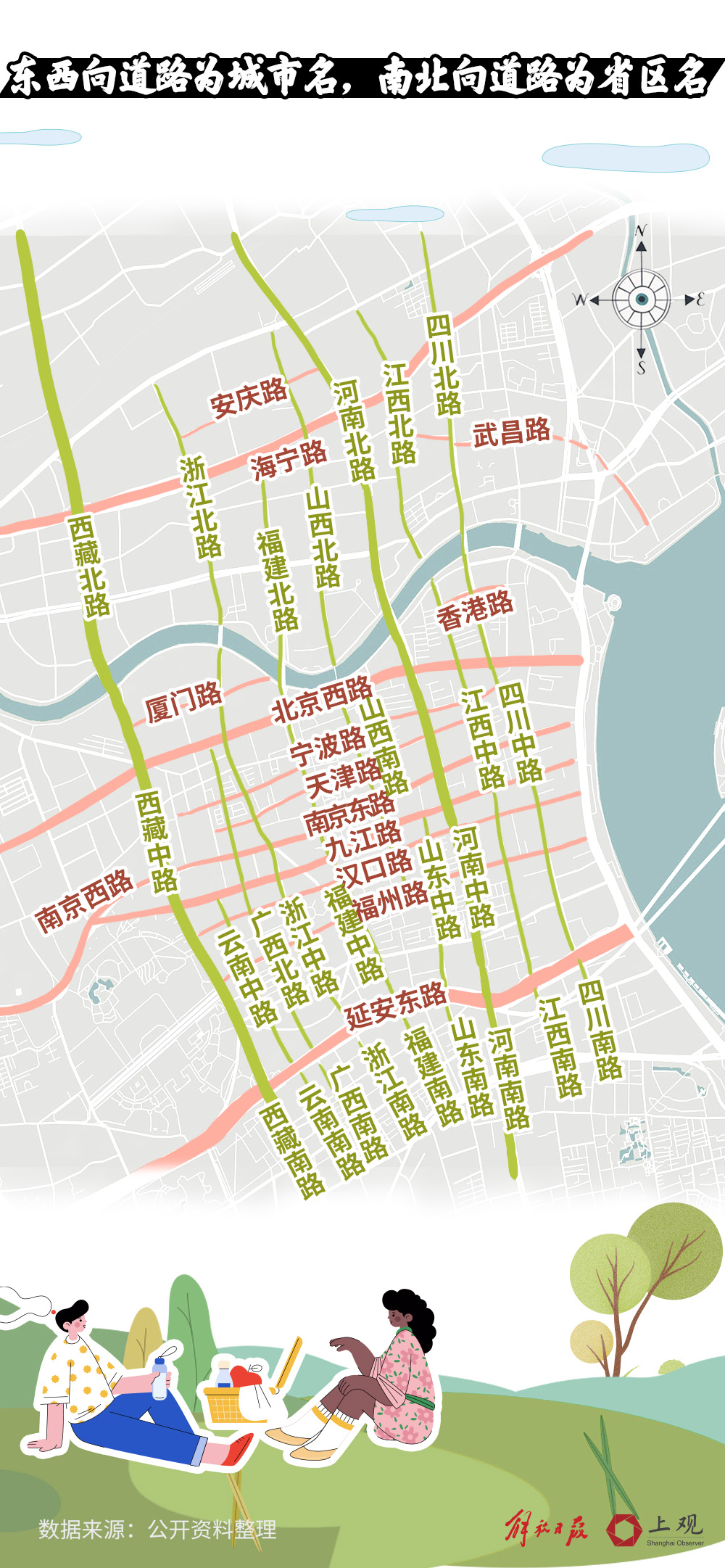 “东西向道路用各地的城市名,南北向道路则用各个省区名”,是上海道路普遍采用的命名原则。