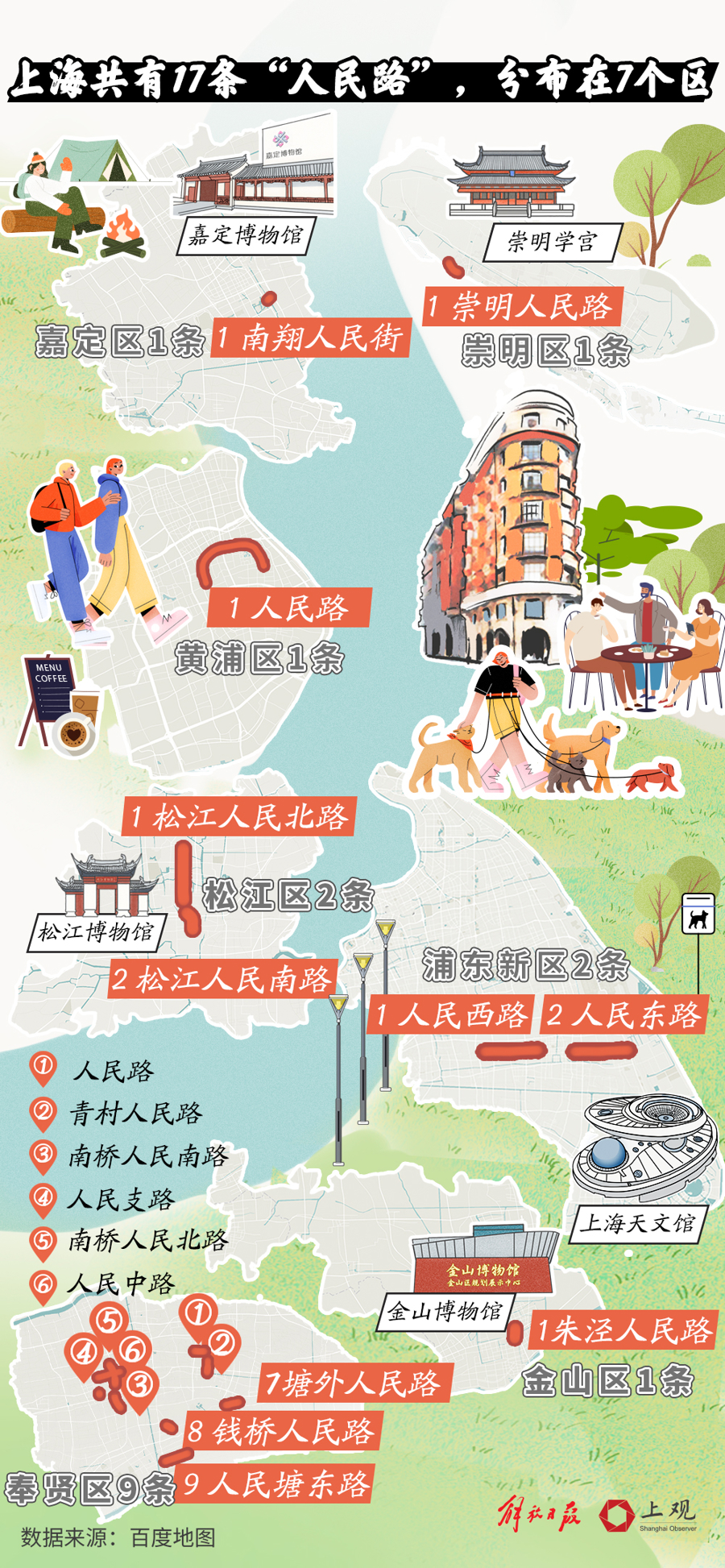 这些“人民路”分布在7个区,最多的是奉贤区,有9条“人民路”:钱桥人民路、塘外人民路、南桥人民北路等。