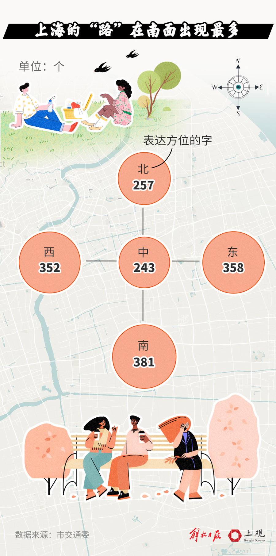 除了上述对路段定义的词和代表方位的“东”“南”“西”“北”外,上海的路名里最常出现的是“新”“家”“镇”“桥”“山”。