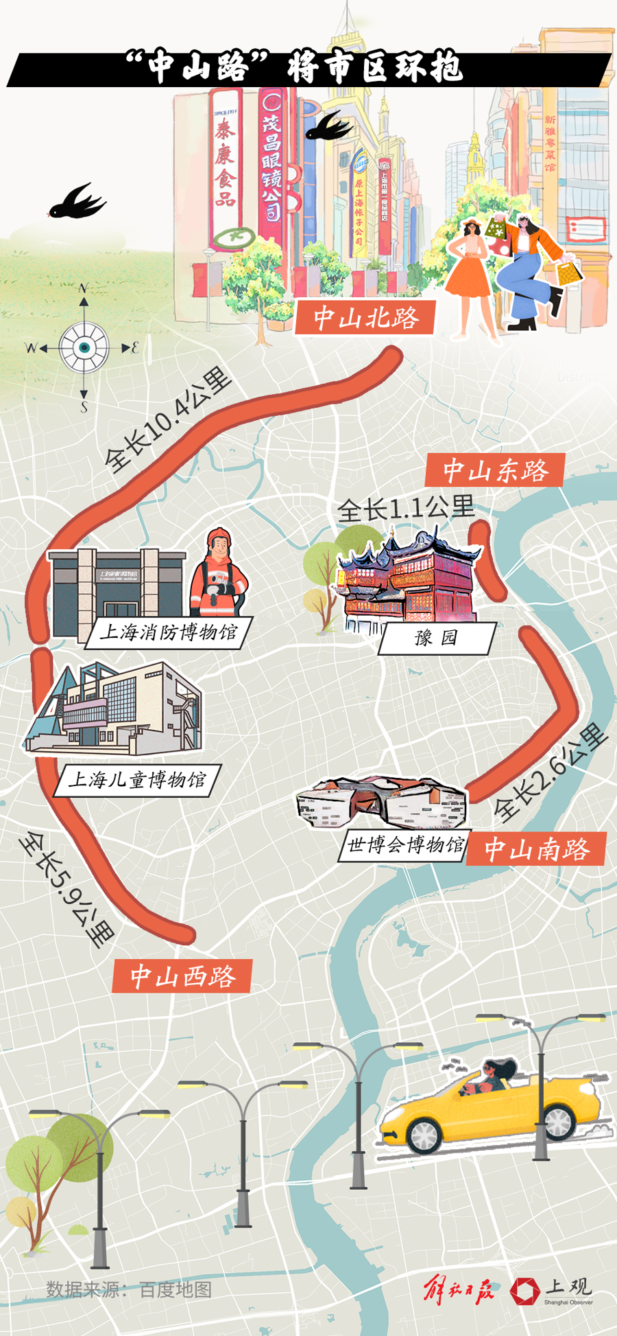 将东南西北的“中山路”在地图上拼在一起,“中山路”正好把上海市区环抱。