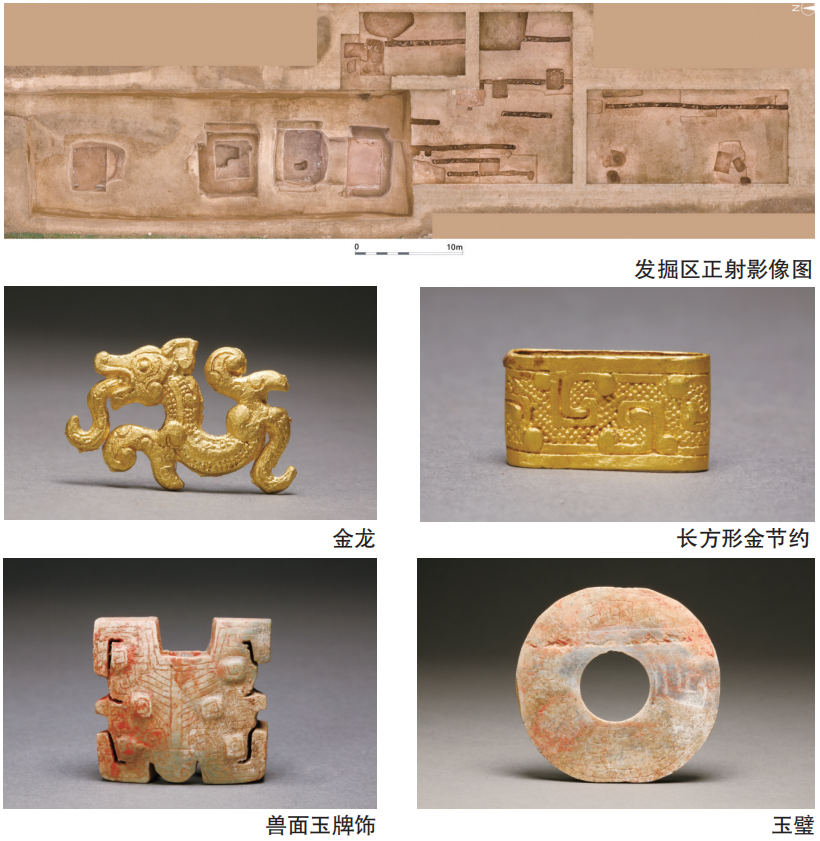 为进一步揭示下站遗址布局及祭祀遗存内涵,2022年,经国家文物局批准,联合考古队对下站遗址进行第二次考古发掘,发掘面积800平方米。共发现祭祀坑25座,其中清理发掘祭祀坑22座,按形制不同可分为长条形坑和长方形坑两类。发掘者介绍,长方形坑中的车马坑规模较大,南北排列整齐,长3.6-4.75米、宽2.98-3.6米。祭祀坑虽被严重盗扰,但盗洞中仍然出土较丰富的遗物,包括玉器、玉车马饰件、金车马饰件、青铜残件、漆皮以及马骨等,有的马骨被铜锈沁染,呈铜绿色,有的马骨上还沾有朱砂,由此推测此类祭祀坑底原放置有以金、玉、铜器装饰的高等级车马。坑底均发现有板灰痕迹,虽被破坏,但仍可辨认出盖板、侧板及底板,由此可知车马原应放置在木箱中。