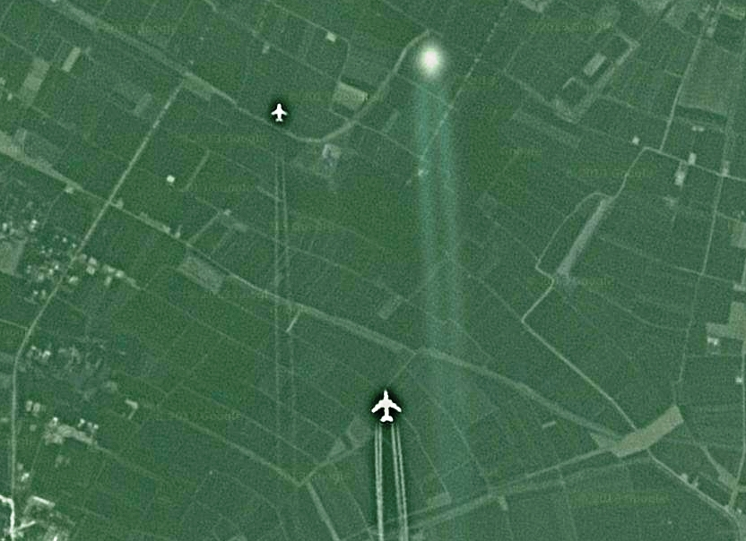 近日,来自GOOGLE地球的一张卫星图片在网络上引起不小关注。在这张“河南省驻马店市正阳县东金庄”地区的卫星地图上,出现了两架飞行中飞机,而飞机前方的是一个圆形不明飞行物,三者都拖着长长的尾迹,形成了一副追逐的画面,不少人都认为这是中国战机正在跟踪、追赶UFO的现场。