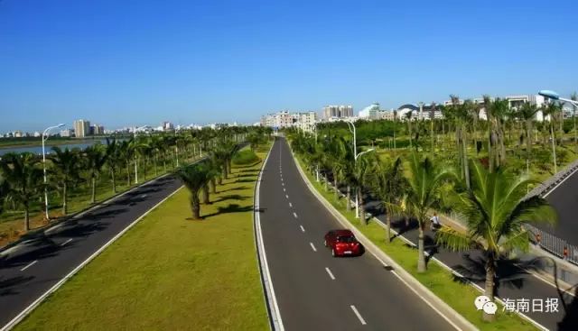 碧海大道东起南渡江入海口,西至美丽沙,一边是琼州海峡的白沙碧浪,一岸是海岛的椰林如海,集热带风光、海景、河景、滩景、桥景、街景、公园等不同的景观于一体,是海口市最新、景观最优的滨海景观大道之一,堪称海口市的“椰梦长廊”。