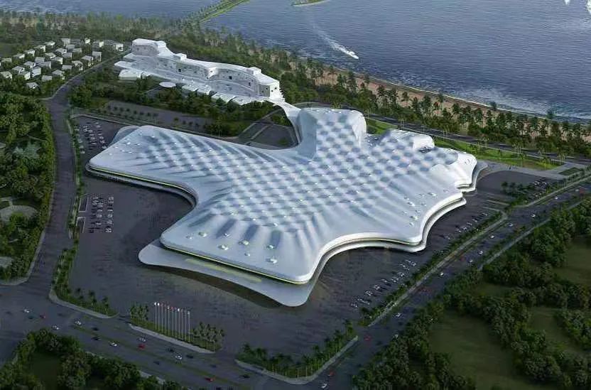 这里是本次海口马拉松赛马拉松项目的终点。会展中心由2008年北京奥运会“鸟巢”团队设计,建有展览中心、会议中心、一家五星级酒店、一家海上七星级酒店等,同时还将保留了原海洋世界公园的主景区。从高空俯瞰,整体建筑造型宛如一只展翅飞翔的海鸥,在满足功能使用的前提下,充分体现出热带滨海省会城市的特色。