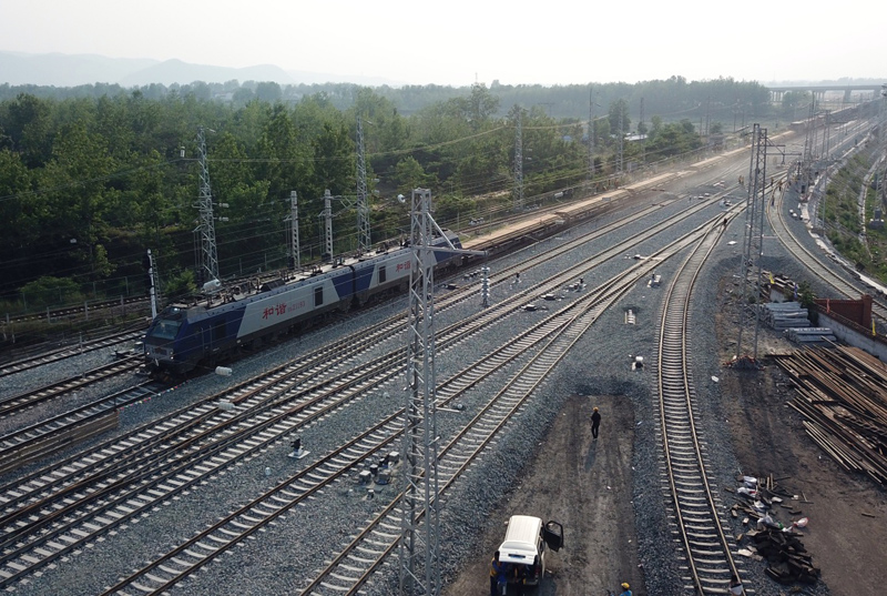 5月16日,货运列车从改建后的阳安二线褒河站通过(无人机拍摄)。